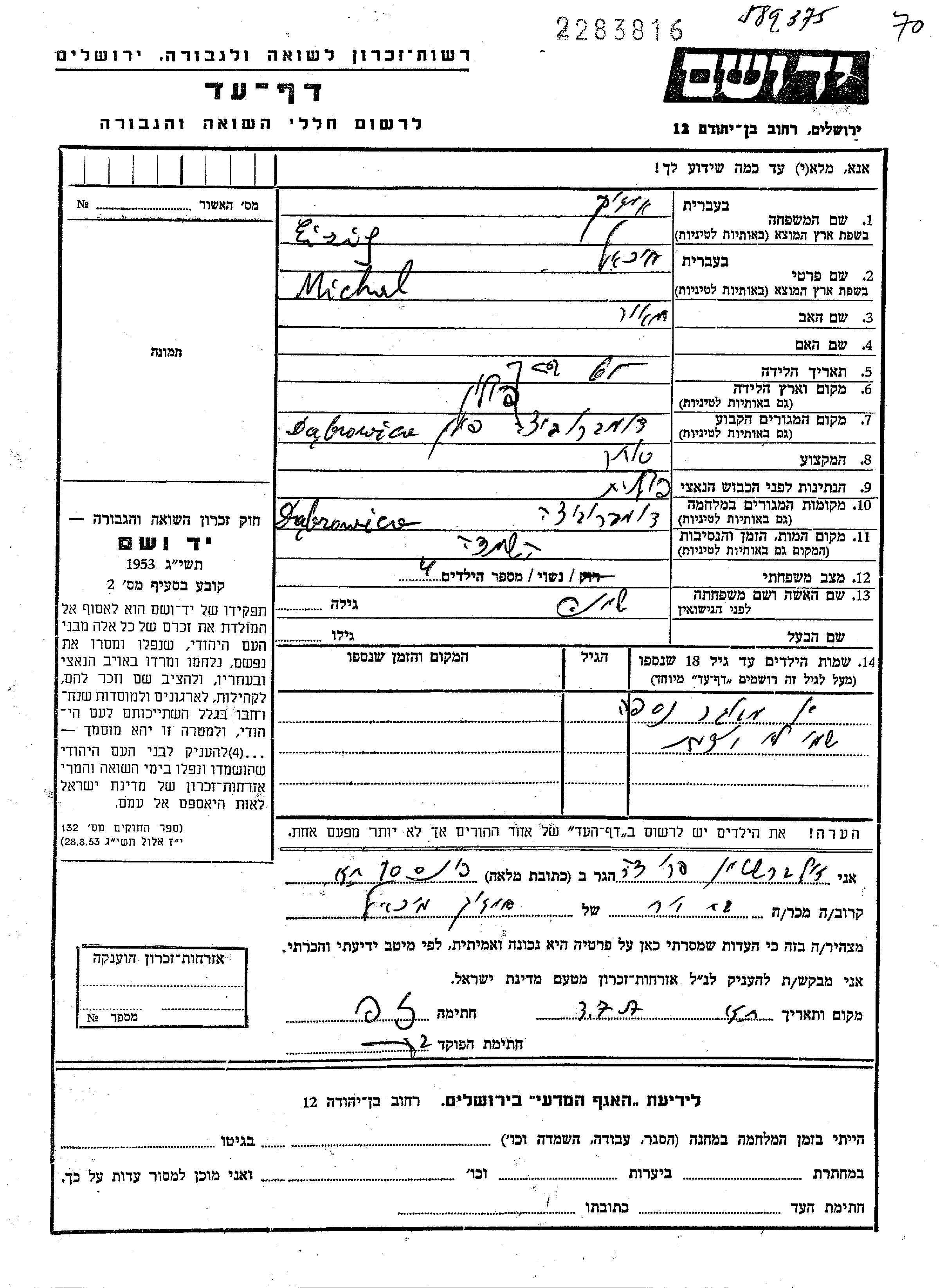 Эйзиг Михаль Домбровица, Польша Лист свидетельских показаний