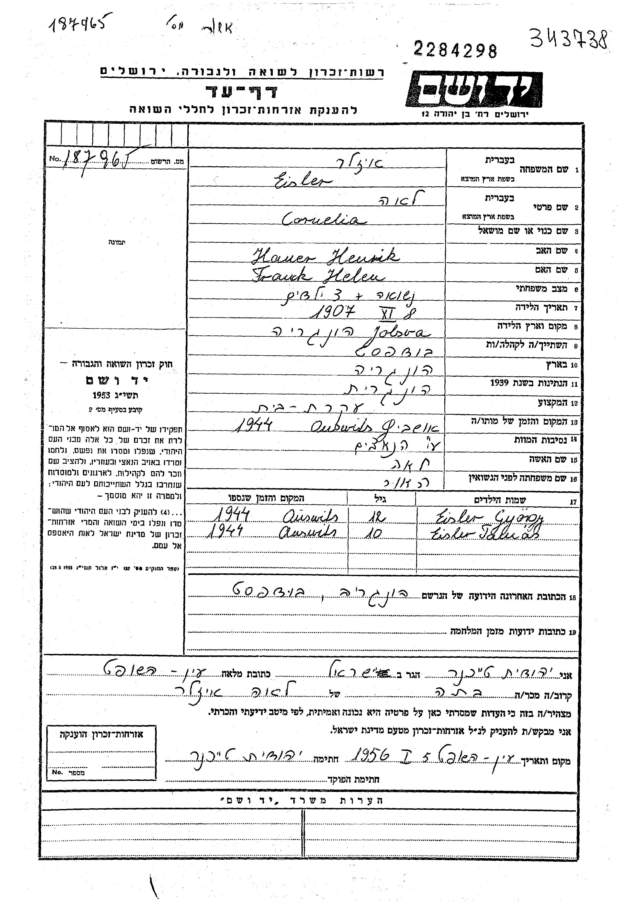 Лея Эйслер, девичья фамилия Хауэр, место рождения: Йольшва, Чехословакия. Отец: Хенрик, mать:Хелен, девичья фамилия Франк. Домохозяйка. Женат / замужем. Место жительства до войны: Будапешт, Венгрия. Место во время войны: Будапешт, Венгрия.