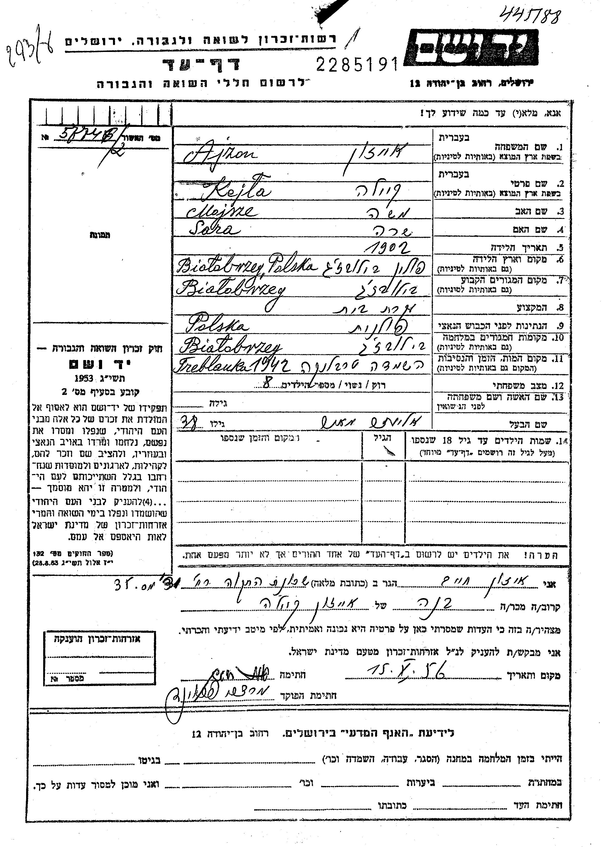 Кейла Айзон, место рождения: Бялобжеги, Польша. Отец: Мойше, mать:Сара. Домохозяйка. Женат / замужем. Место жительства до войны: Бялобжеги, Польша. Место во время войны: Бялобжеги, Польша.
