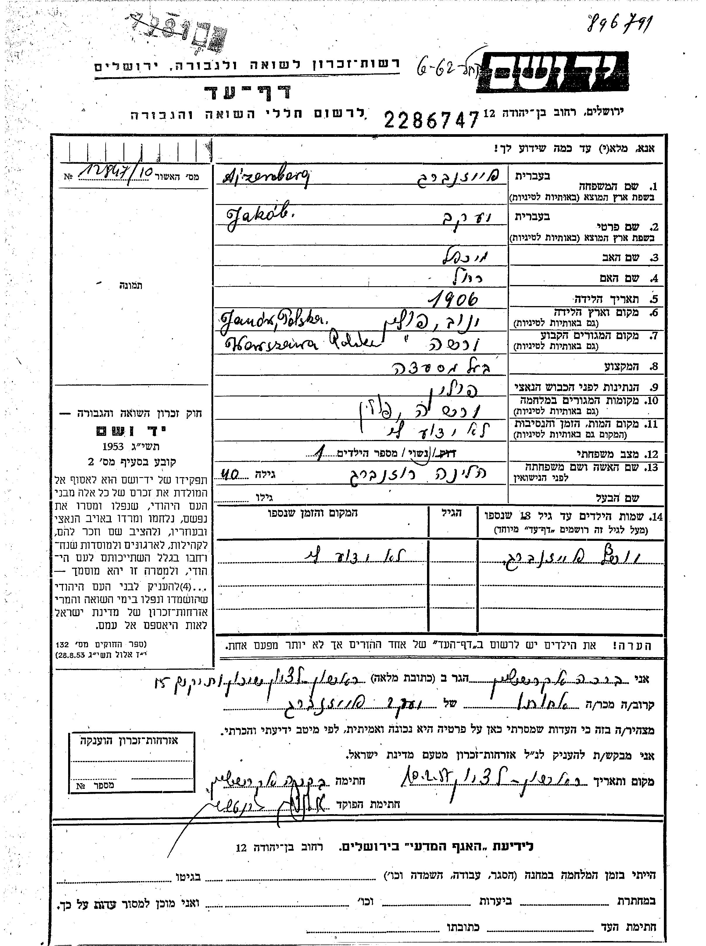 Якоб Айзенберг, место рождения: Янув, Польша. Отец: Михаэль, mать:Рахель. Владелец ресторана. Женат / замужем. Место жительства до войны: Варшава, Польша. Место во время войны: Варшава, Польша.