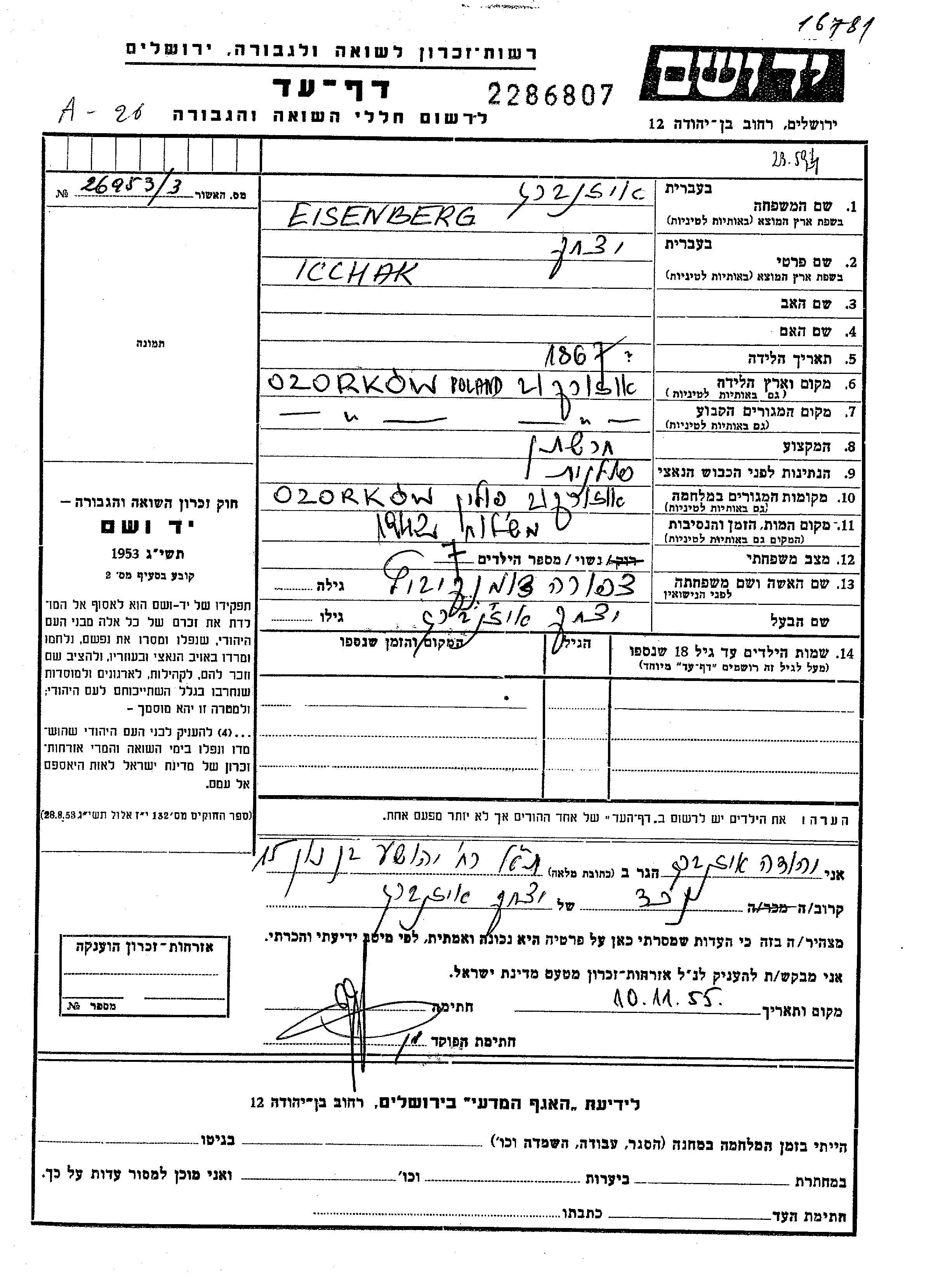 Ицхак Айзенберг, место рождения: Озоркув, Польша. Фабрикант. Женат / замужем. Место жительства до войны: Озоркув, Польша. Место во время войны: Озоркув, Польша.