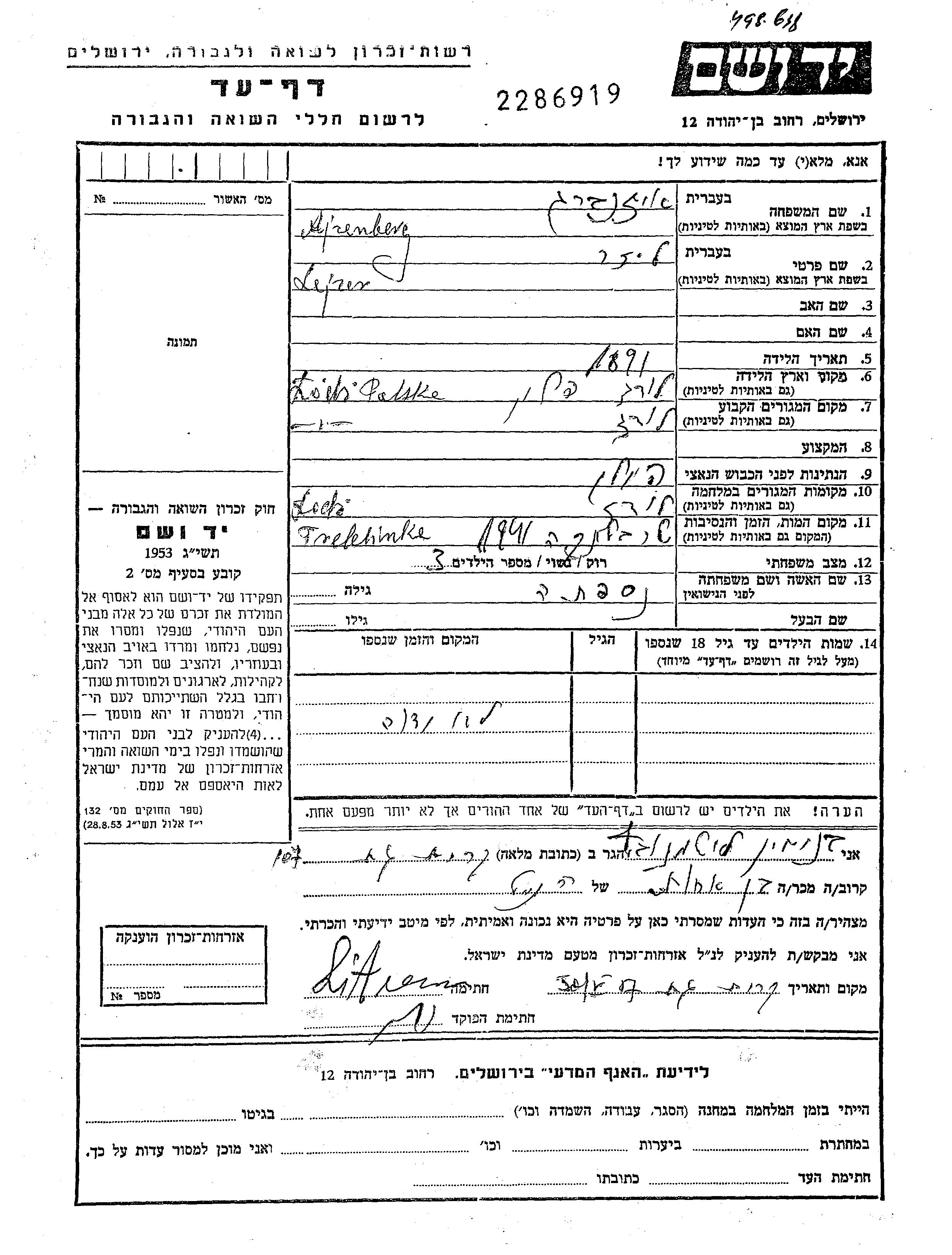 Яд Вашем - Листы свидетельских показаний Мемориального фонда