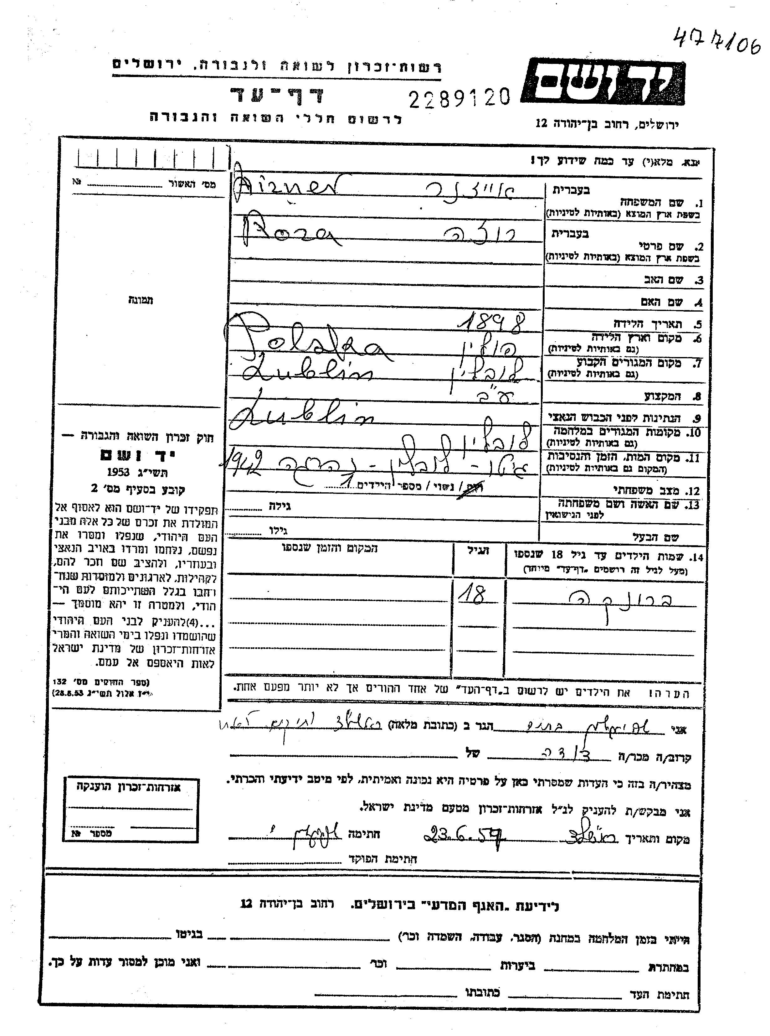 Айзнер Роза 1898 Люблин, Польша Лист свидетельских показаний