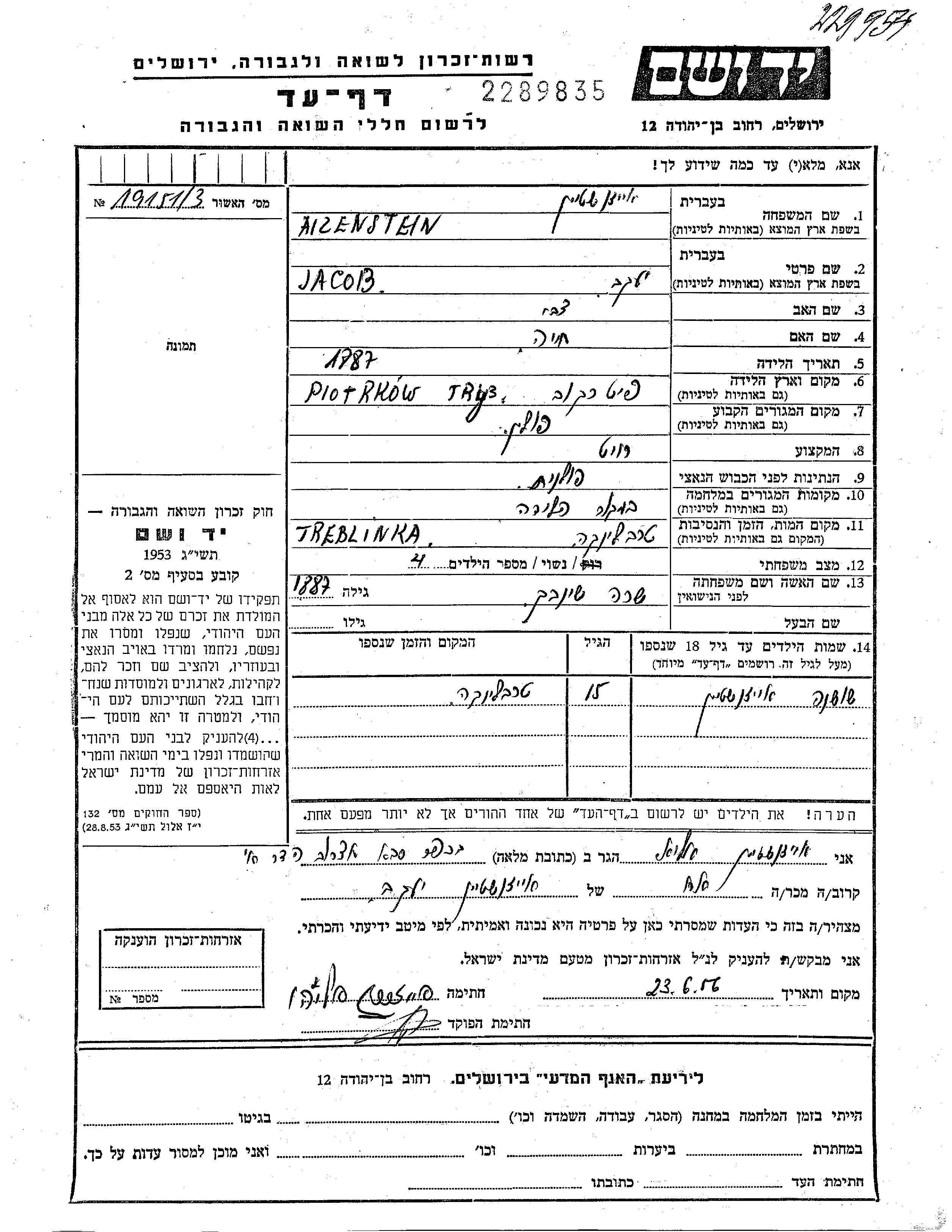 Айзенштейн Якоб 1887 Пётркув-Трыбунальски, Польша Лист свидетельских показаний