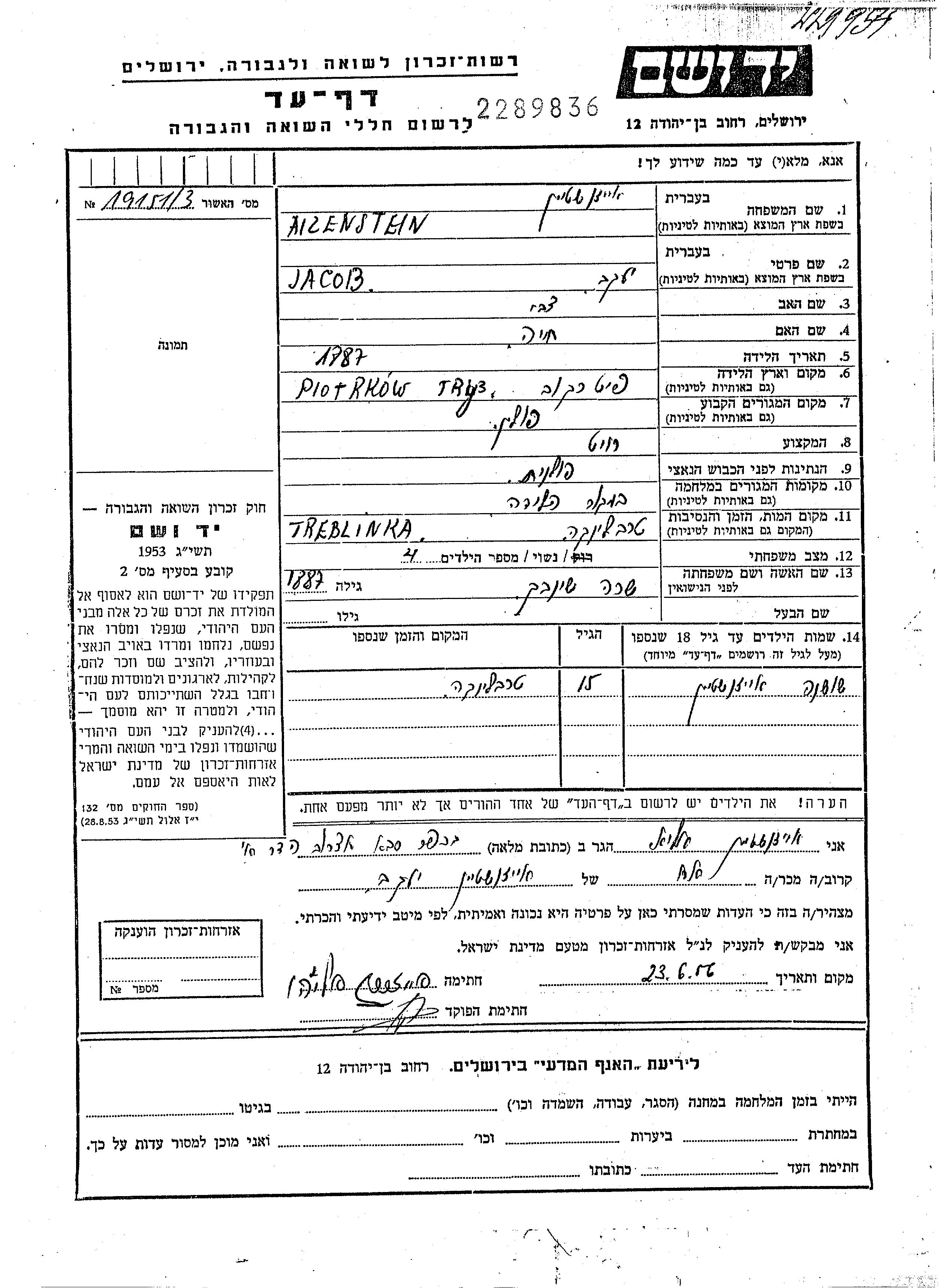 Айзенштейн Шошана Пётркув-Трыбунальски, Польша Лист свидетельских показаний