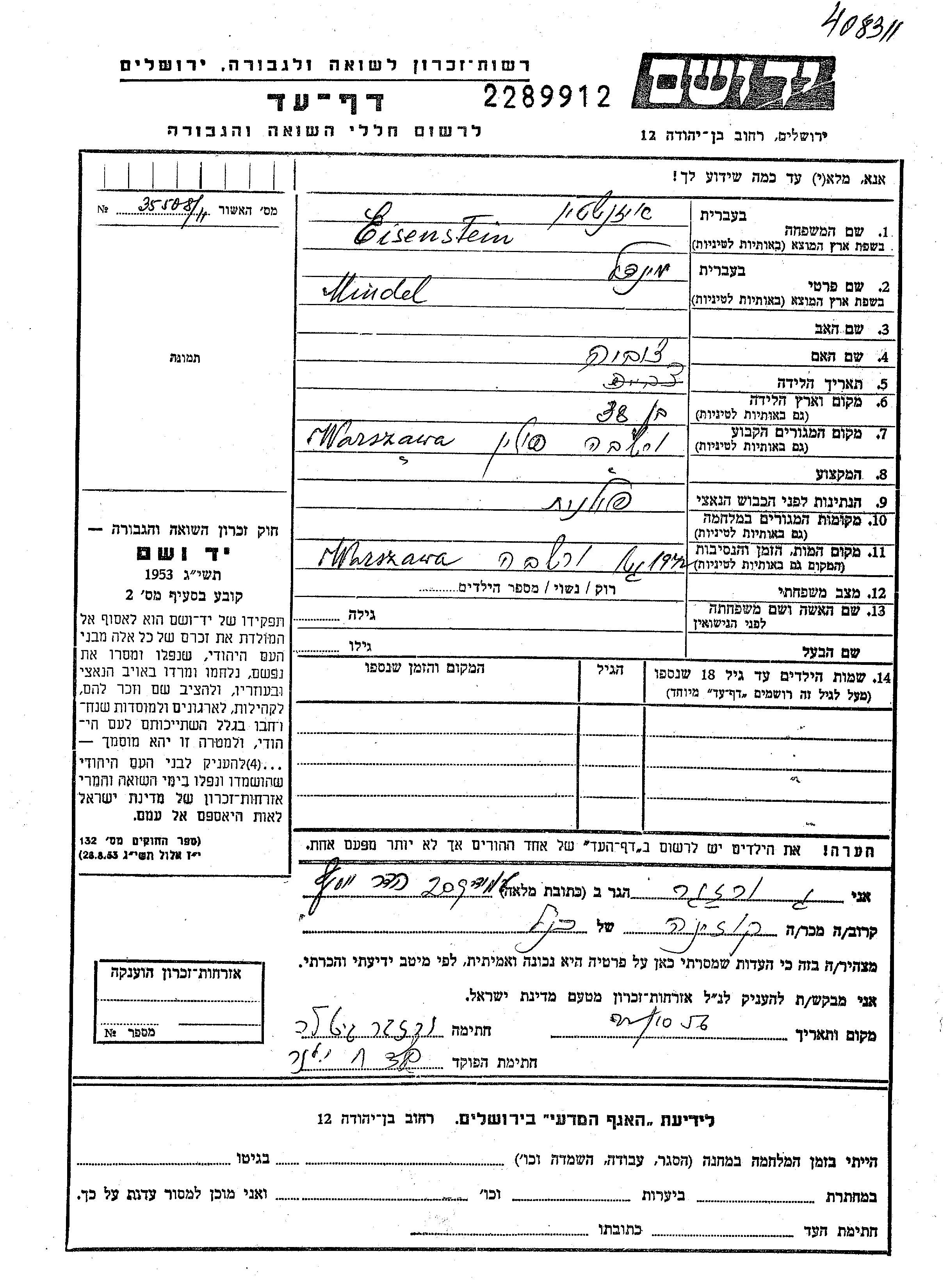 Миндель Айзенштайн. Mать:Цивие. Место жительства до войны: Варшава, Польша. Место во время войны: Польша.