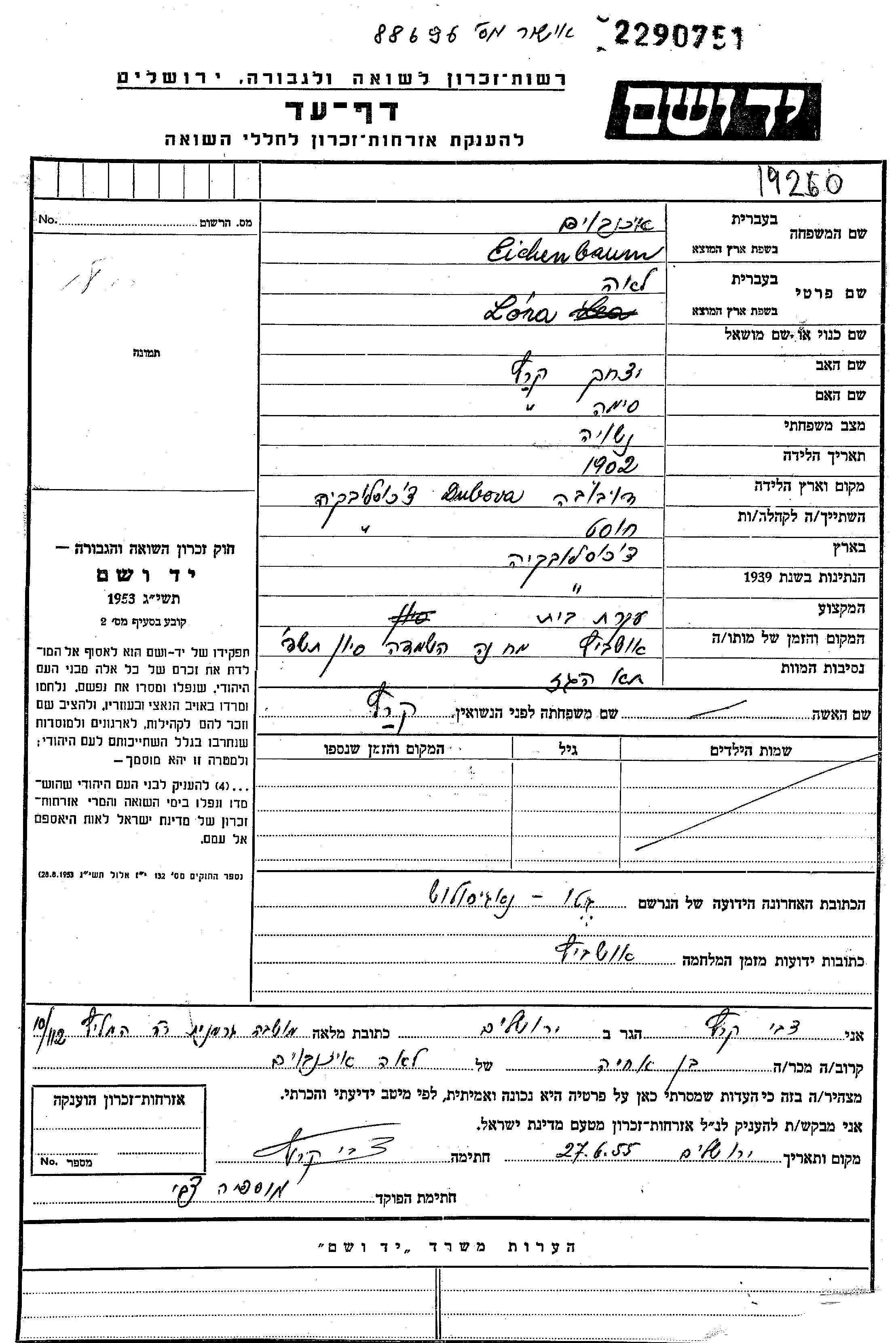 Лора Лея Эйхенбаум, девичья фамилия Крец, место рождения: Дубова, Чехословакия. Отец: Ицхак, mать:Сима. Домохозяйка. Женат / замужем. Место жительства до войны: Хуст, Чехословакия. Место во время войны: Надь-Сёллёш, Чехословакия.