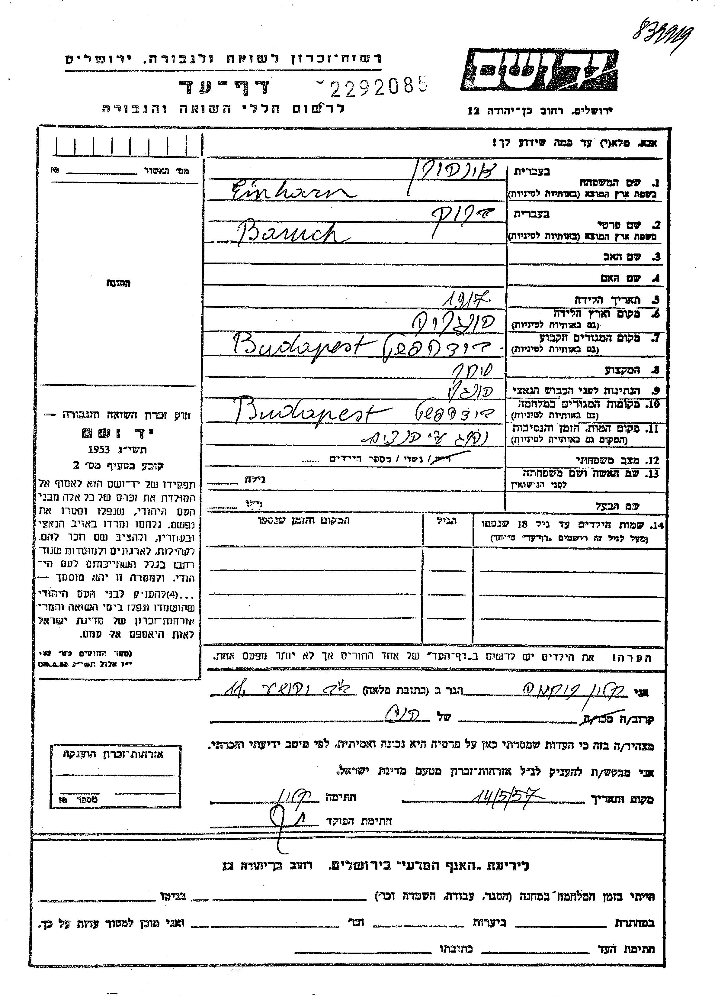 Барух Эйнхорн, место рождения: Венгрия. Торговец / торговка. Женат / замужем. Место жительства до войны: Будапешт, Венгрия. Место во время войны: Будапешт, Венгрия.