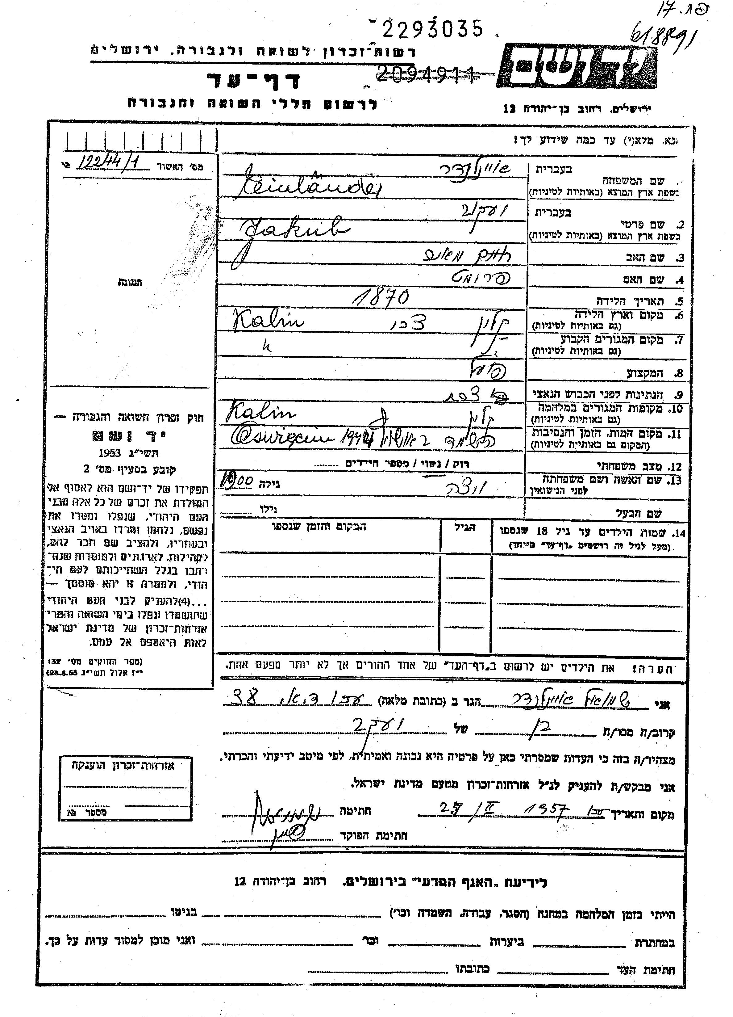 Якуб Эйнландер, место рождения: Калин, Чехословакия. Отец: Хаим Меир, mать:Фримет. Клерк. Женат / замужем. Место жительства до войны: Калин, Чехословакия. Место во время войны: Калин, Чехословакия.