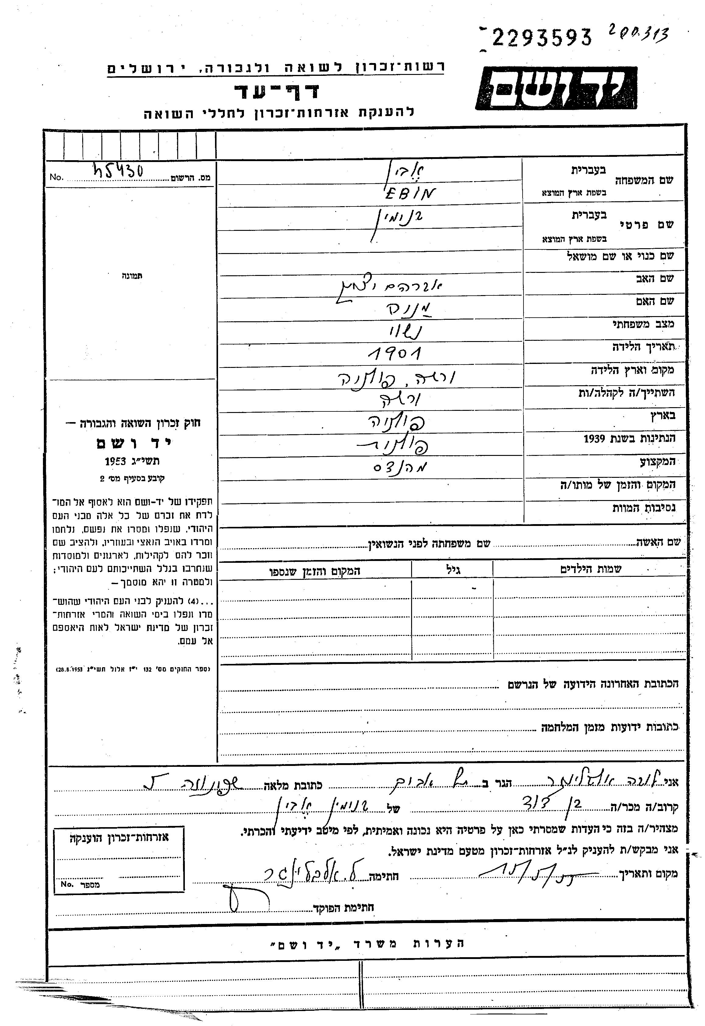 Эбин Беньямин 1901 Варшава, Польша Лист свидетельских показаний