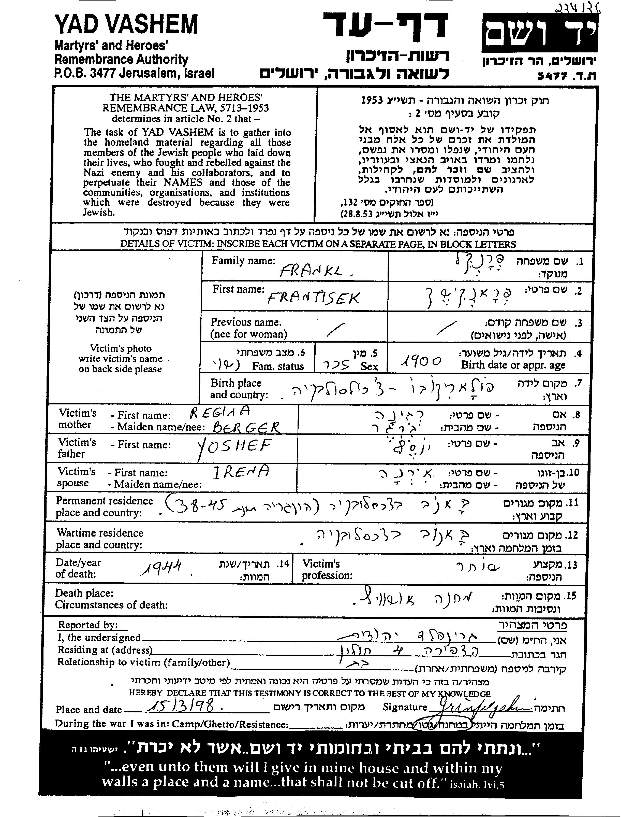Франтишек Франкль, место рождения: Словенски-Медер, Чехословакия. Отец: Йошеф, mать:Регина, девичья фамилия Бергер. Торговец / торговка. Женат / замужем. Место жительства до войны: Банов, Чехословакия. Место во время войны: Банов, Чехословакия.
