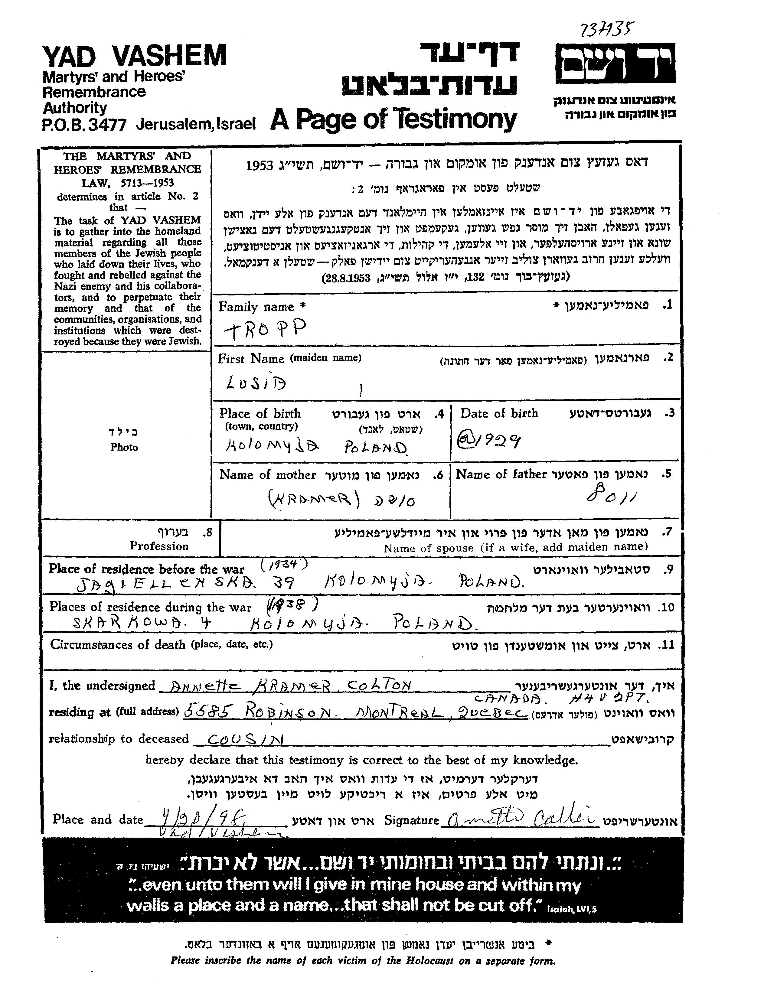 Тропп Труп Лусия Люся 1929 Коломыя, Польша Лист свидетельских показаний