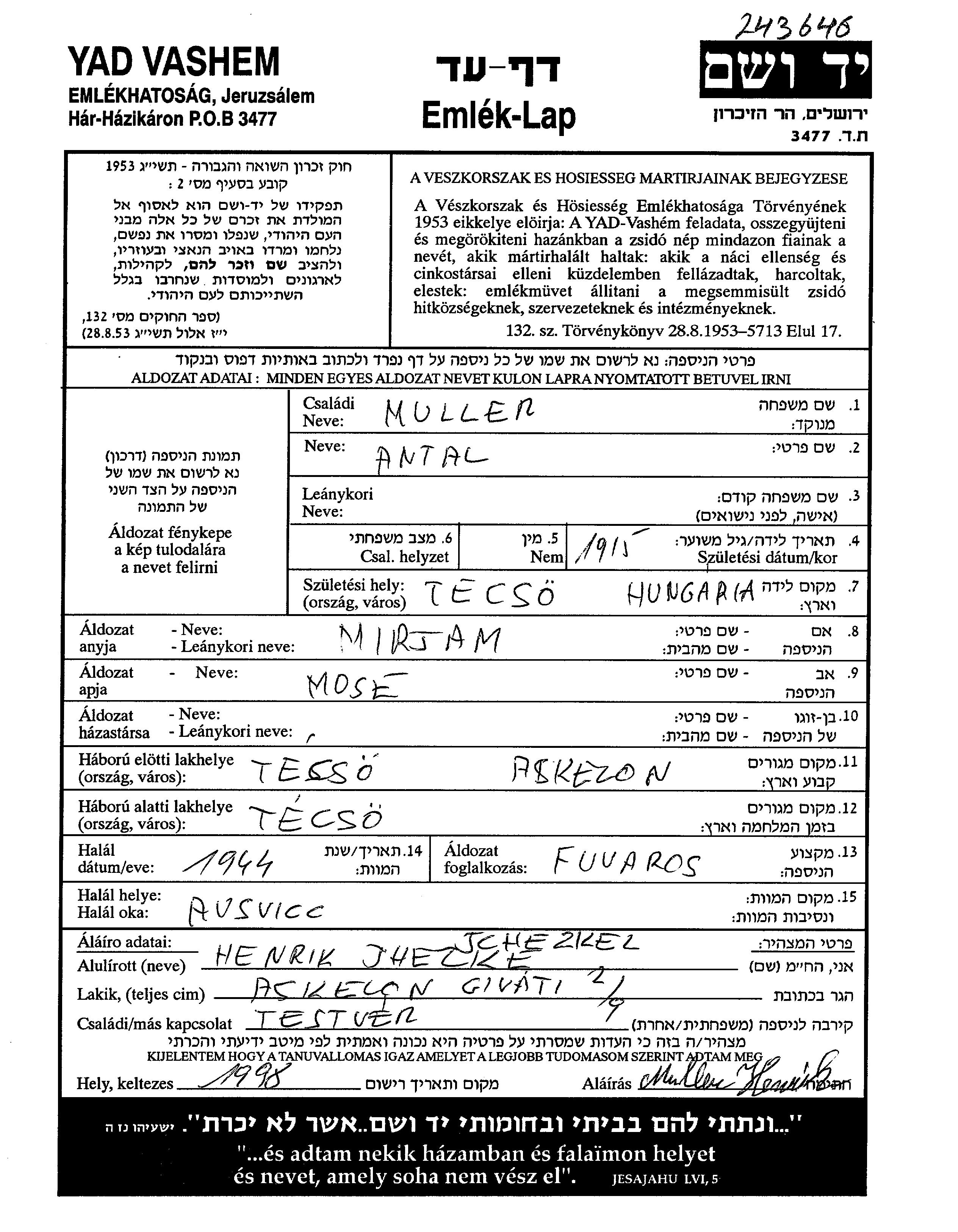 Анталь Мюллер, место рождения: Течё, Чехословакия. Отец: Моше, mать:Мирьям, девичья фамилия Шмилович. Место жительства до войны: Течё, Чехословакия. Место во время войны: Течё, Чехословакия.