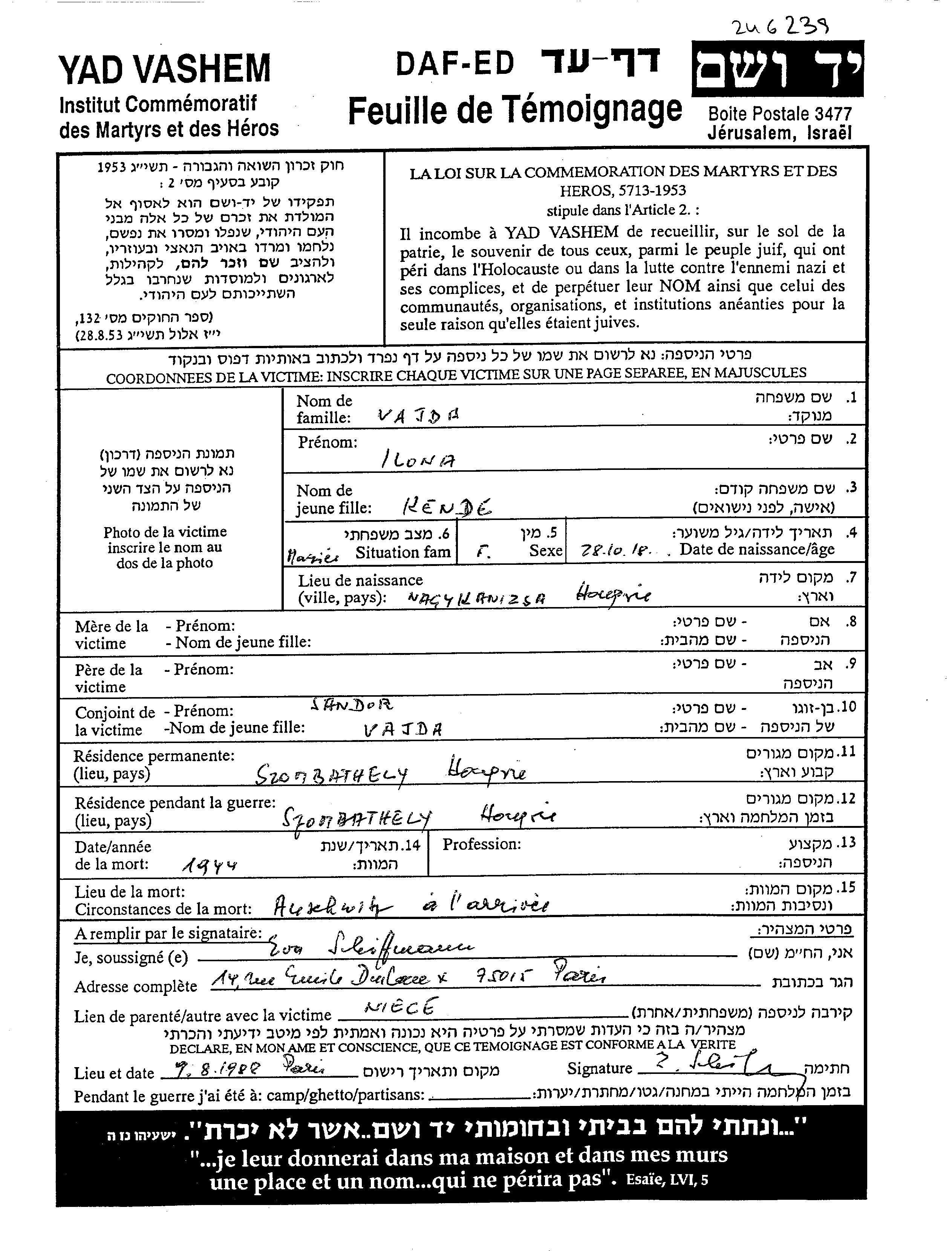 Вайда Илона Сомбатхей, Венгрия Лист свидетельских показаний