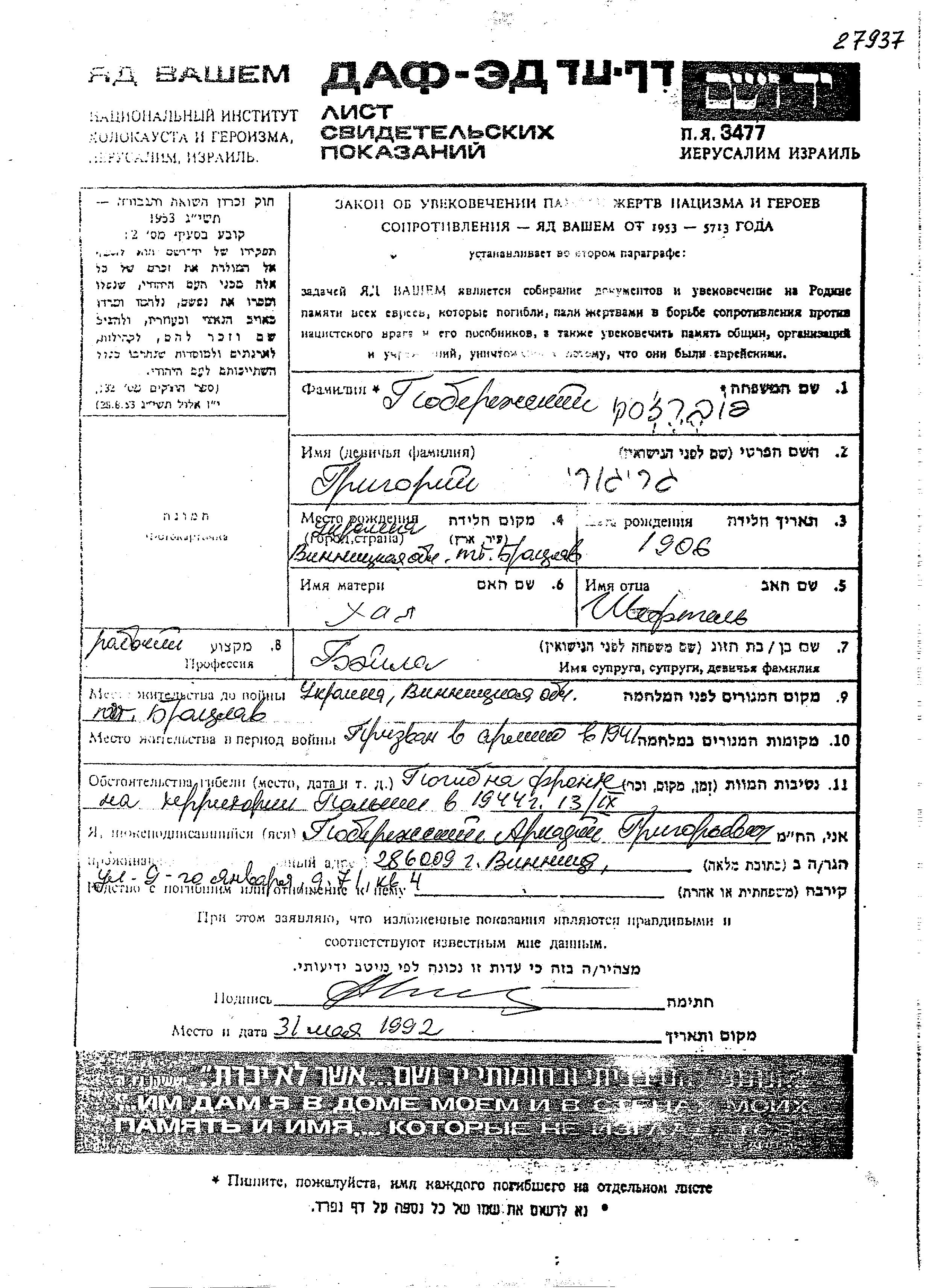 Григорий Побережский, место рождения: Брацлав, Украина (СССР). Отец: Шафтель, mать:Хая. Рабочий / рабочая. Женат / замужем. Место жительства до войны: Брацлав, Украина (СССР). Место во время войны: Вооруженные силы Советского Союза. Григорий уничтожен в период Шоа. место смерти: Польша в 13/09/1944.