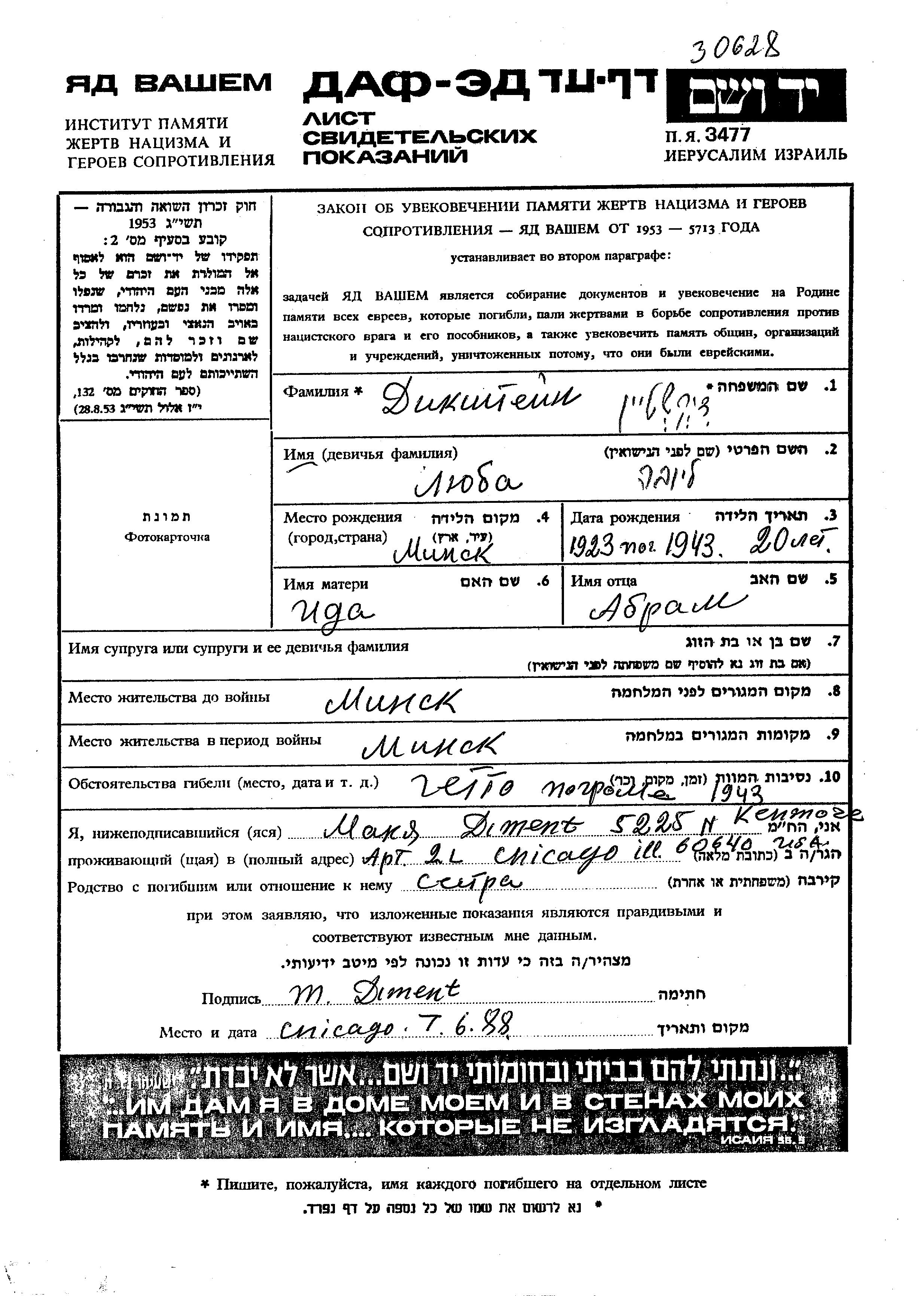 Дикштейн Люба 1923 Минск, Белоруссия (СССР) Лист свидетельских показаний