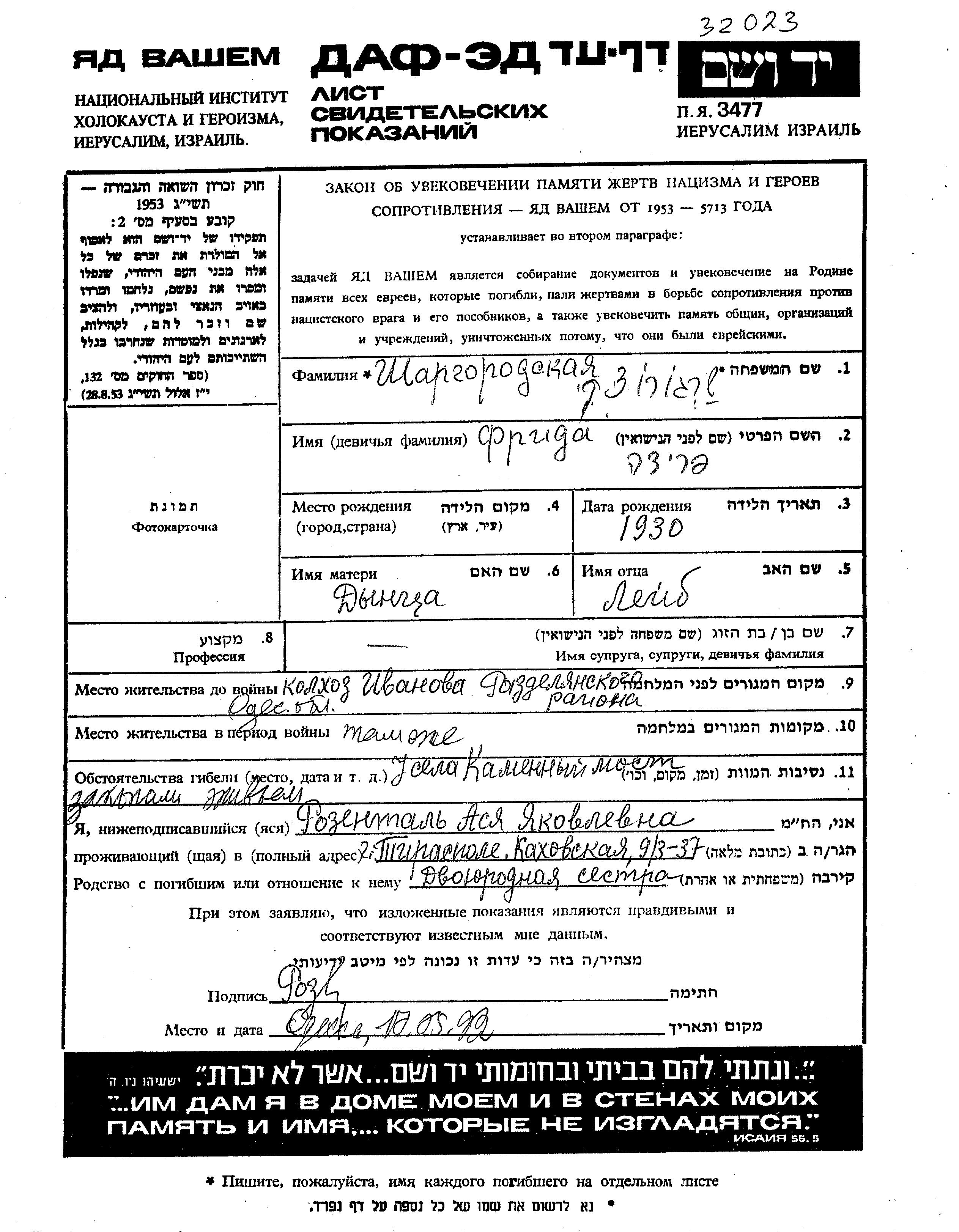 Яд Вашем - Листы свидетельских показаний Мемориального фонда