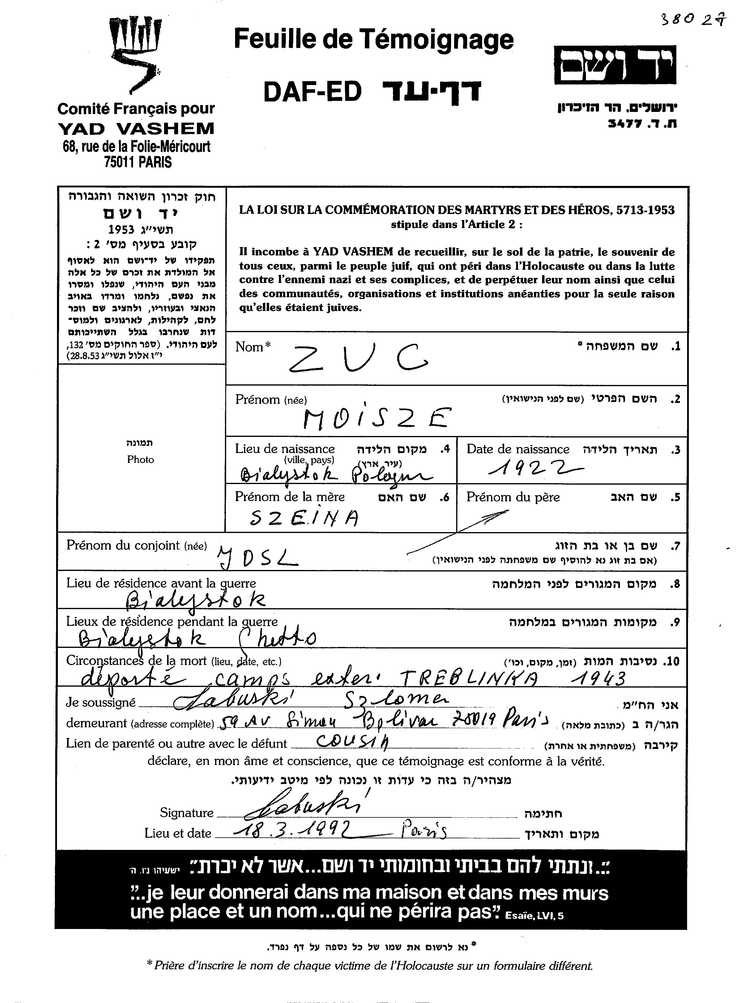 Зуц Мойше 1922 Белосток, Польша Лист свидетельских показаний