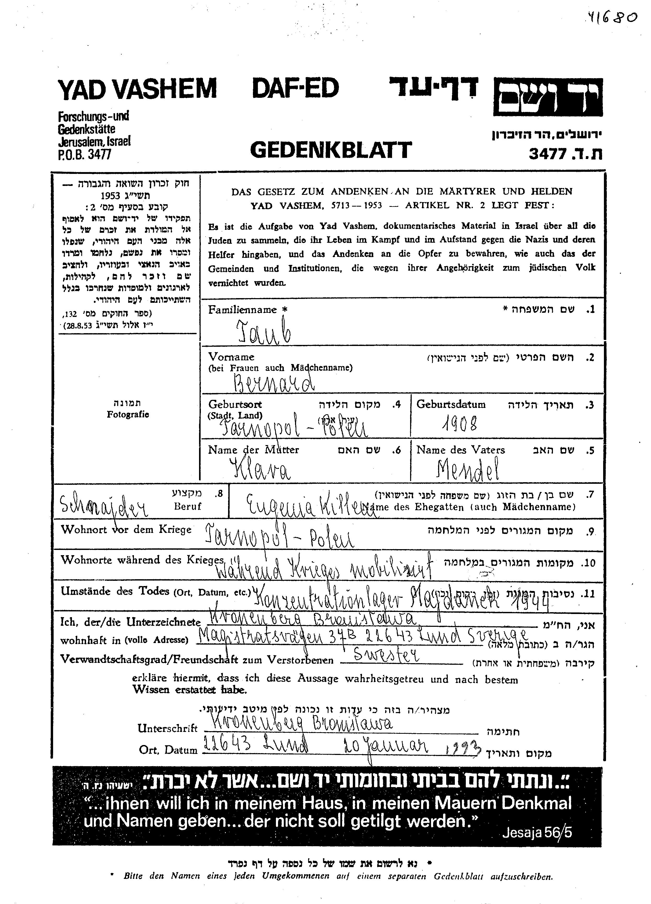 Бернард Тауб, место рождения: Тарнополь, Польша. Отец: Мендель, mать:Клара. Сапожник. Женат / замужем. Место жительства до войны: Тарнополь, Польша. Место во время войны: Вооруженные силы Польши.