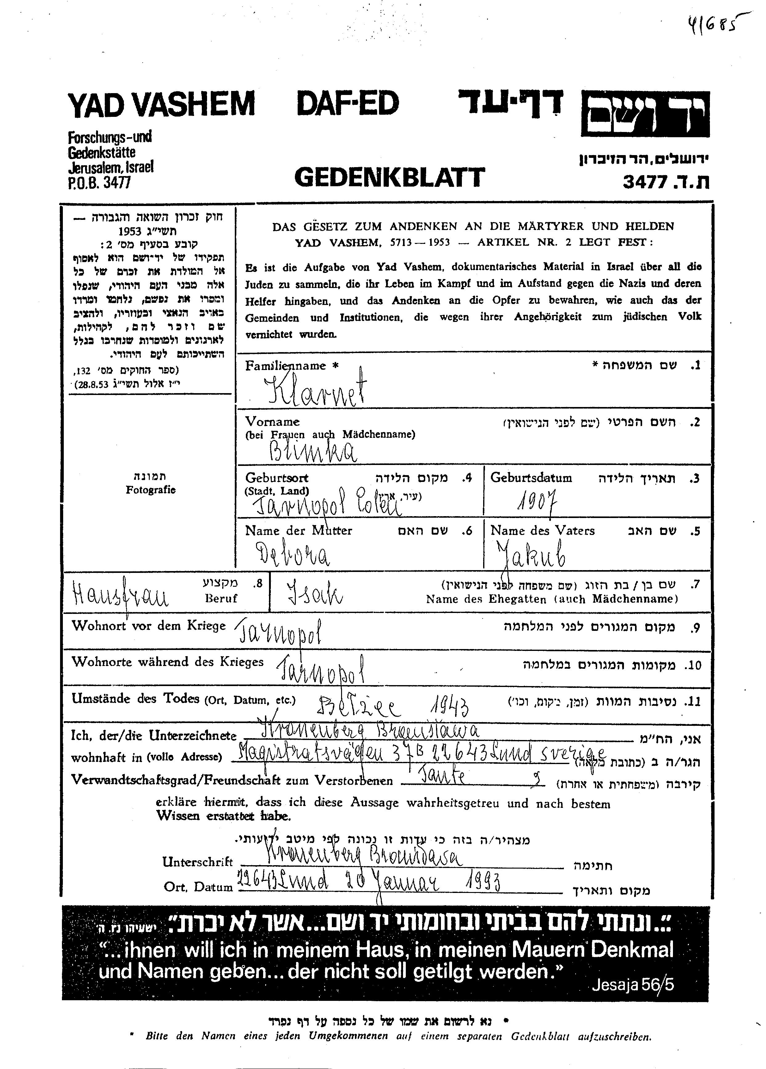 Блимка Кларнет, место рождения: Тарнополь, Польша. Отец: Якуб, mать:Дебора. Домохозяйка. Женат / замужем. Место жительства до войны: Тарнополь, Польша. Место во время войны: Тарнополь, Польша.
