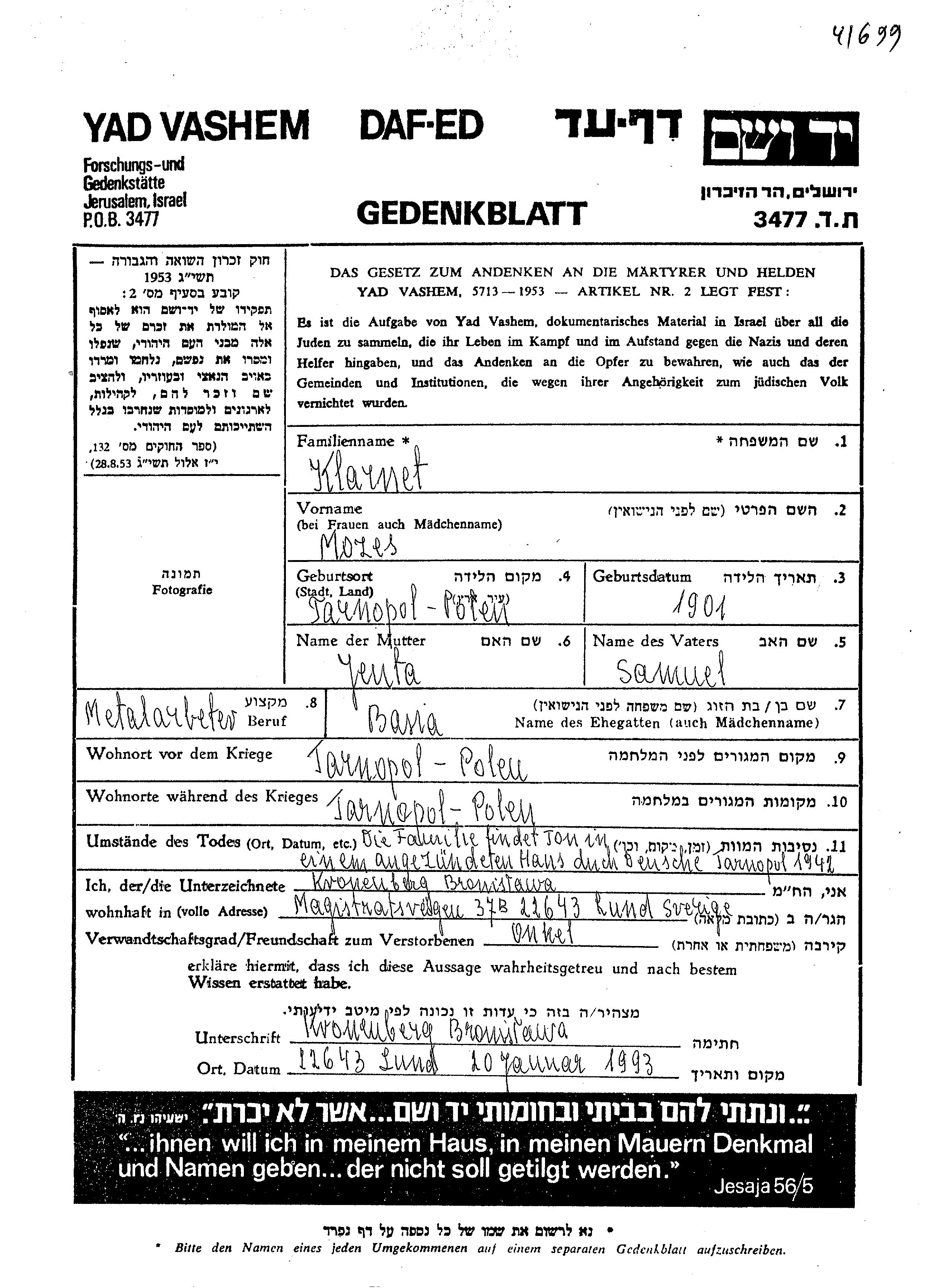 Можес Кларнет, место рождения: Тарнополь, Польша. Отец: Самуэль, mать:Ента. Рабочий / рабочая. Женат / замужем. Место жительства до войны: Тарнополь, Польша. Место во время войны: Тарнополь, Польша.