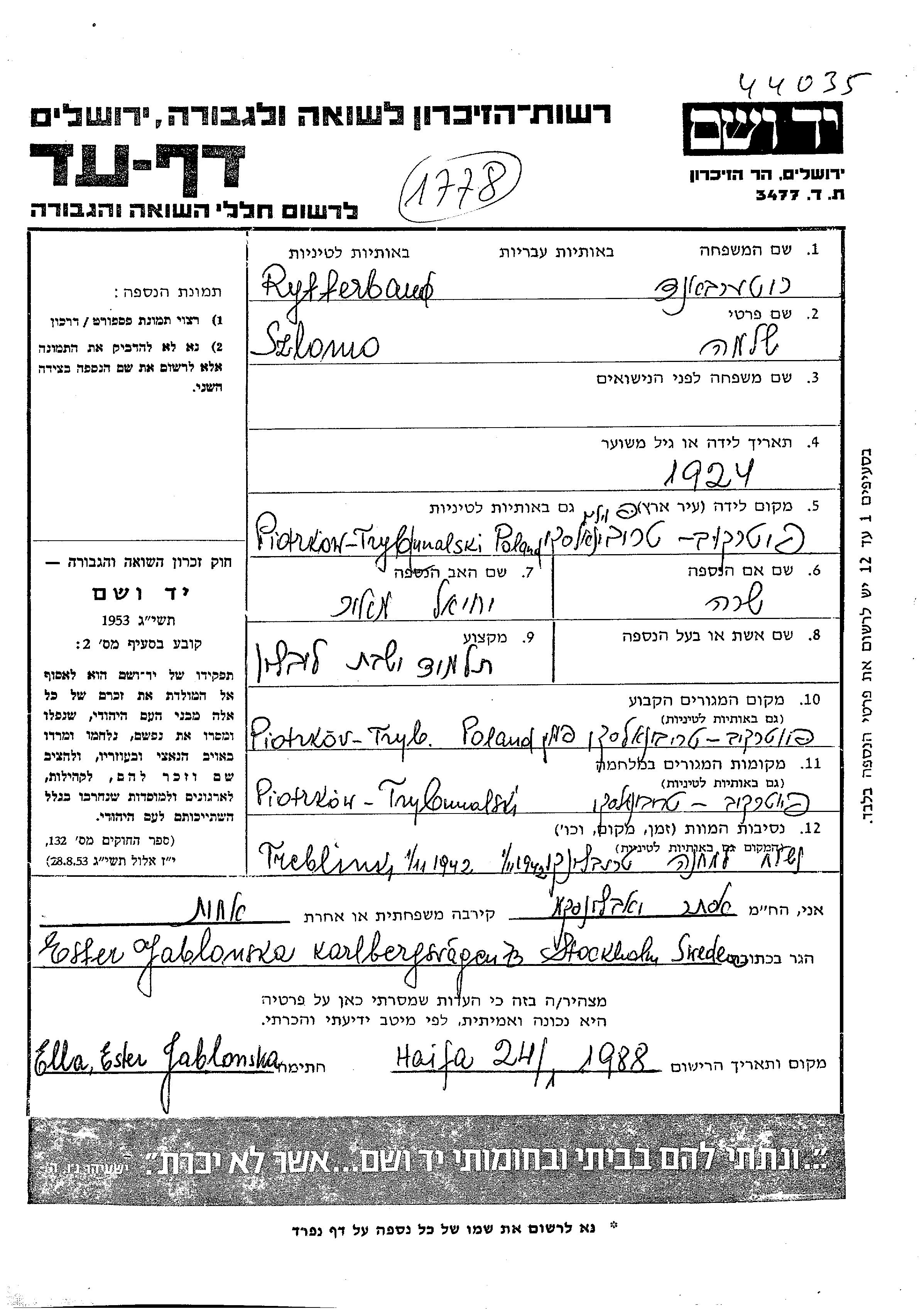 Рыттербанд Шломо 1924 Пётркув-Трыбунальски, Польша Лист свидетельских показаний