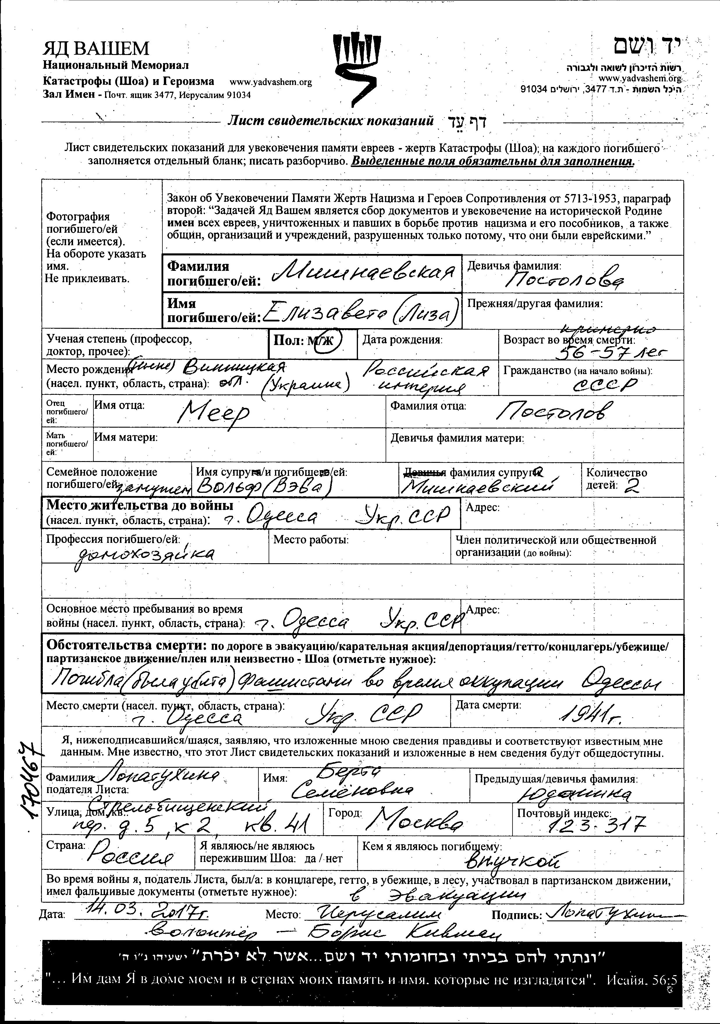 Мишнаевская Елизавета Одесса, Украина (СССР) Лист свидетельских показаний