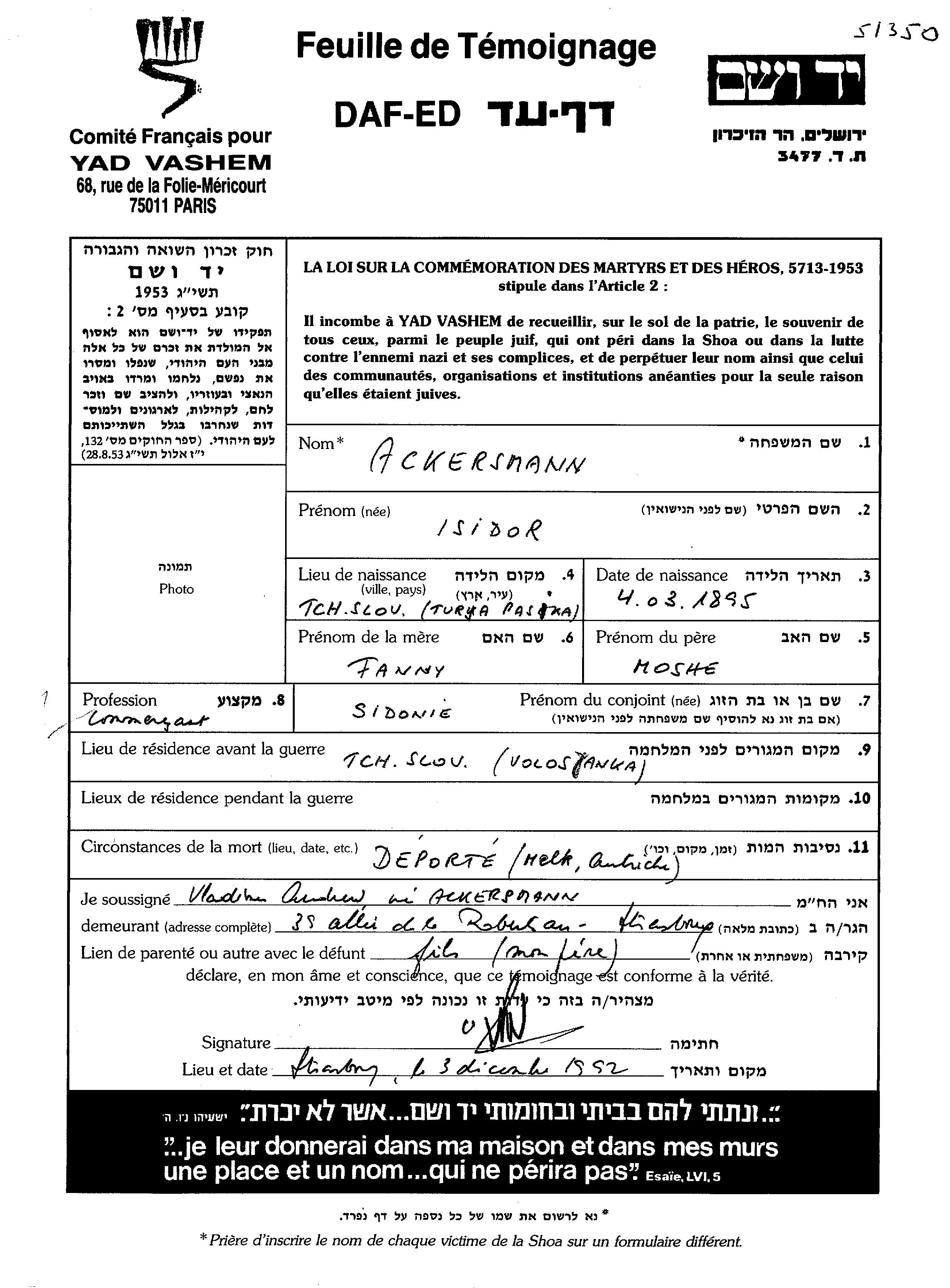 Акерсман Исидор 1895 Волосянка, Чехословакия Лист свидетельских показаний