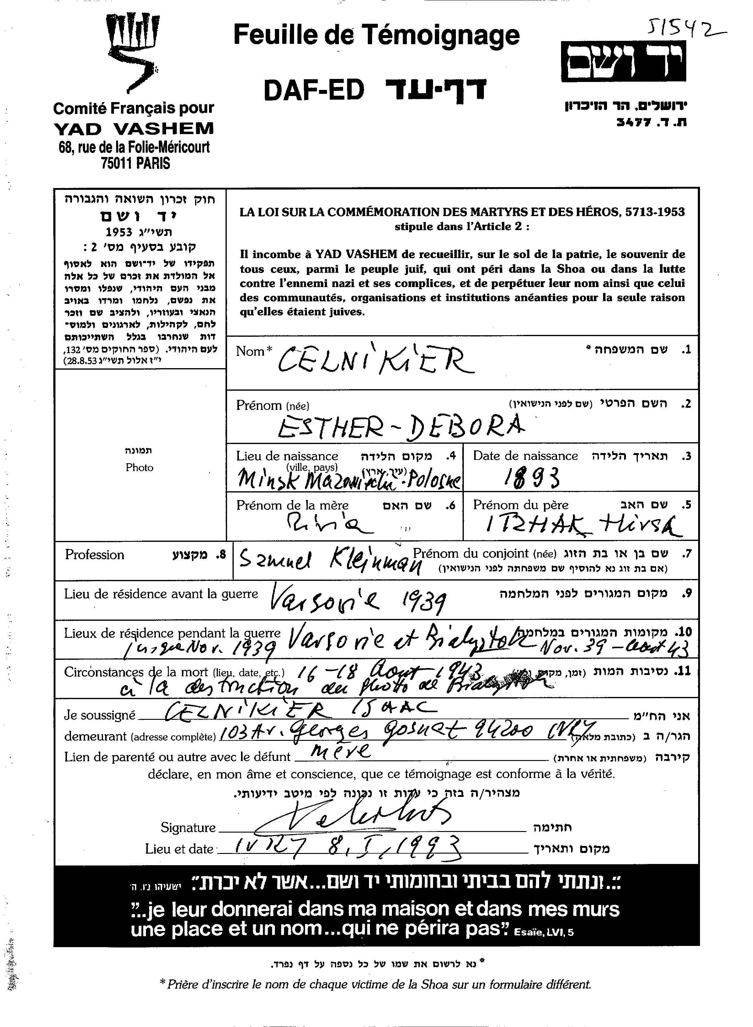 Эстер Дебора Цельникер, место рождения: Минск, Белоруссия (СССР). Отец: Ицхак Хирш, mать:Зивия Цивья. Женат / замужем. Место жительства до войны: Варшава, Польша. Место во время войны: Белосток, Польша.