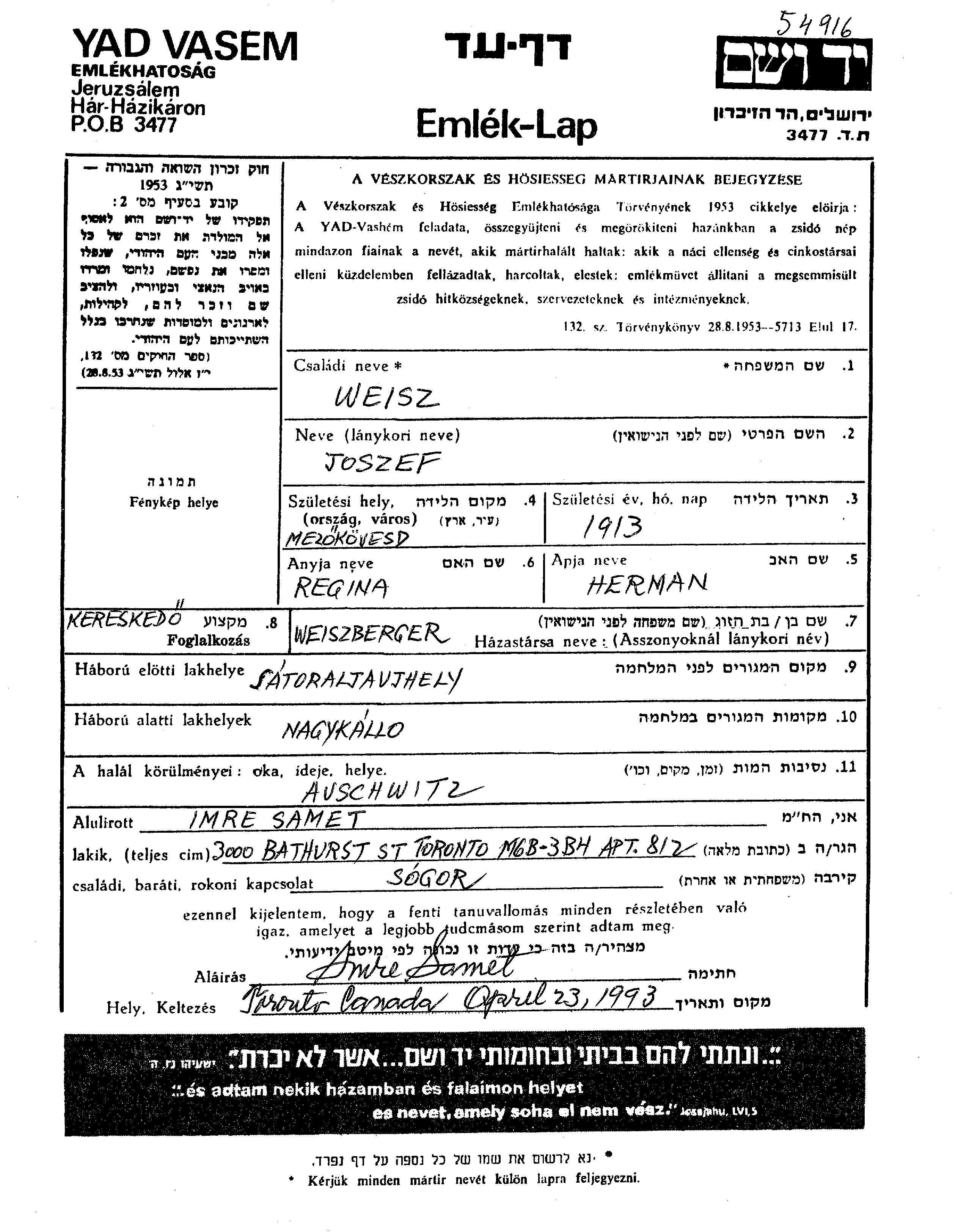Иосеф Вейс, место рождения: Мезёкёвешд, Венгрия. Отец: Херман, mать:Регина, девичья фамилия Хофштадтер. Торговец / торговка. Женат / замужем. Место жительства до войны: Шаторальяуйхей, Венгрия. Место во время войны: Надькалло, Венгрия.