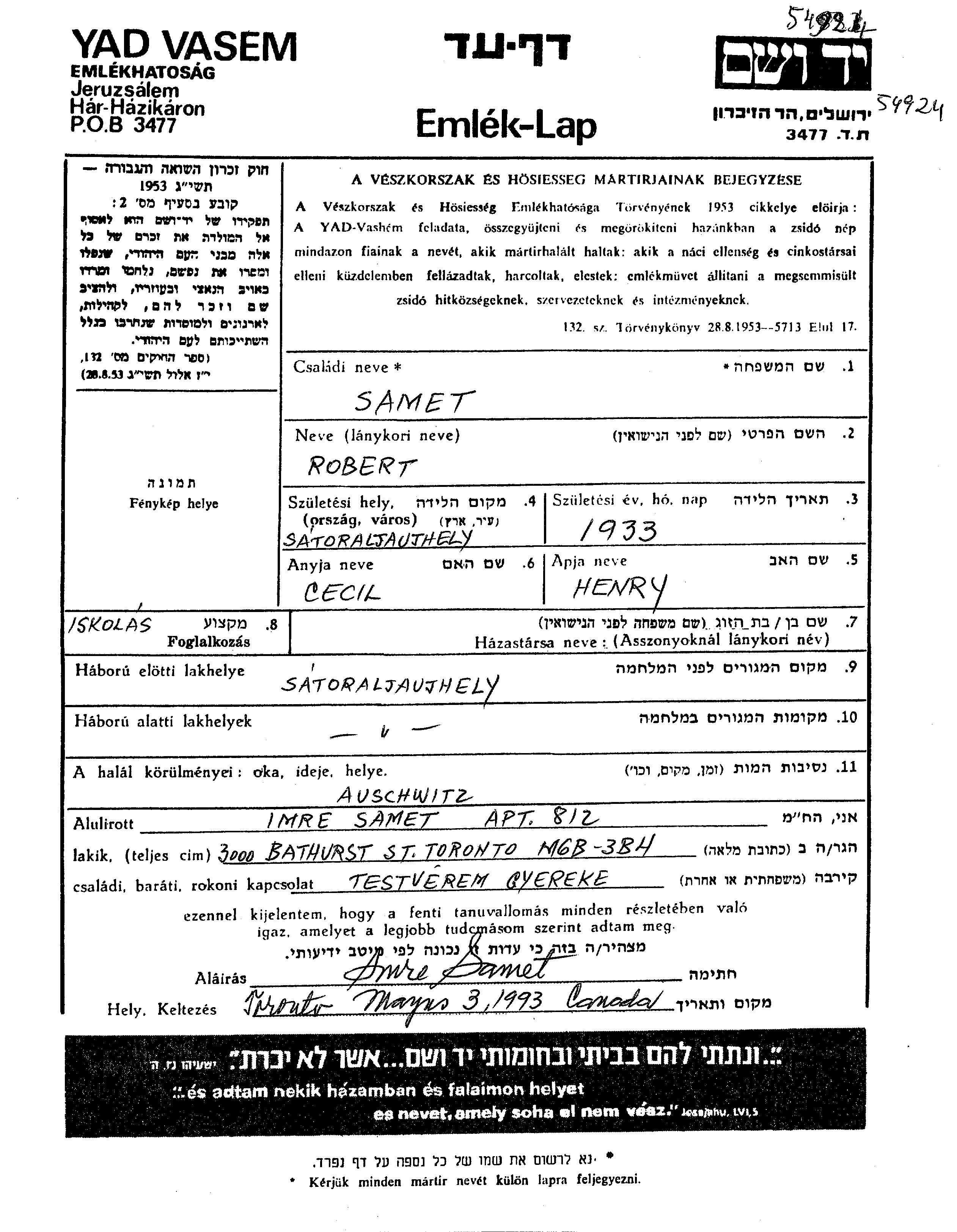 Самет Роберт 1933 Шаторальяуйхей, Венгрия Лист свидетельских показаний