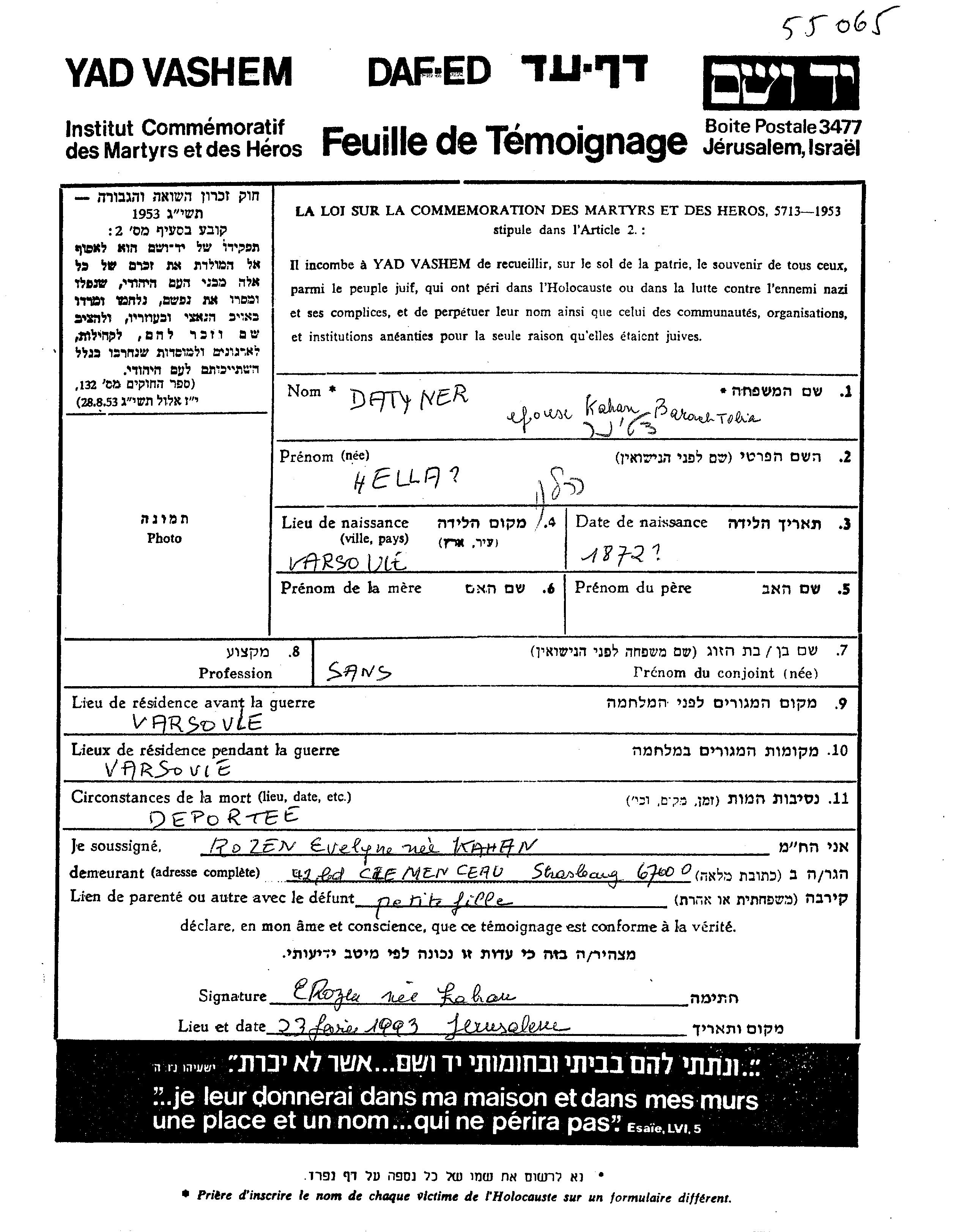 Хелла Кахан, девичья фамилия Датинер, место рождения: Варшава, Польша. Женат / замужем. Место жительства до войны: Варшава, Польша. Место во время войны: Варшава, Польша.