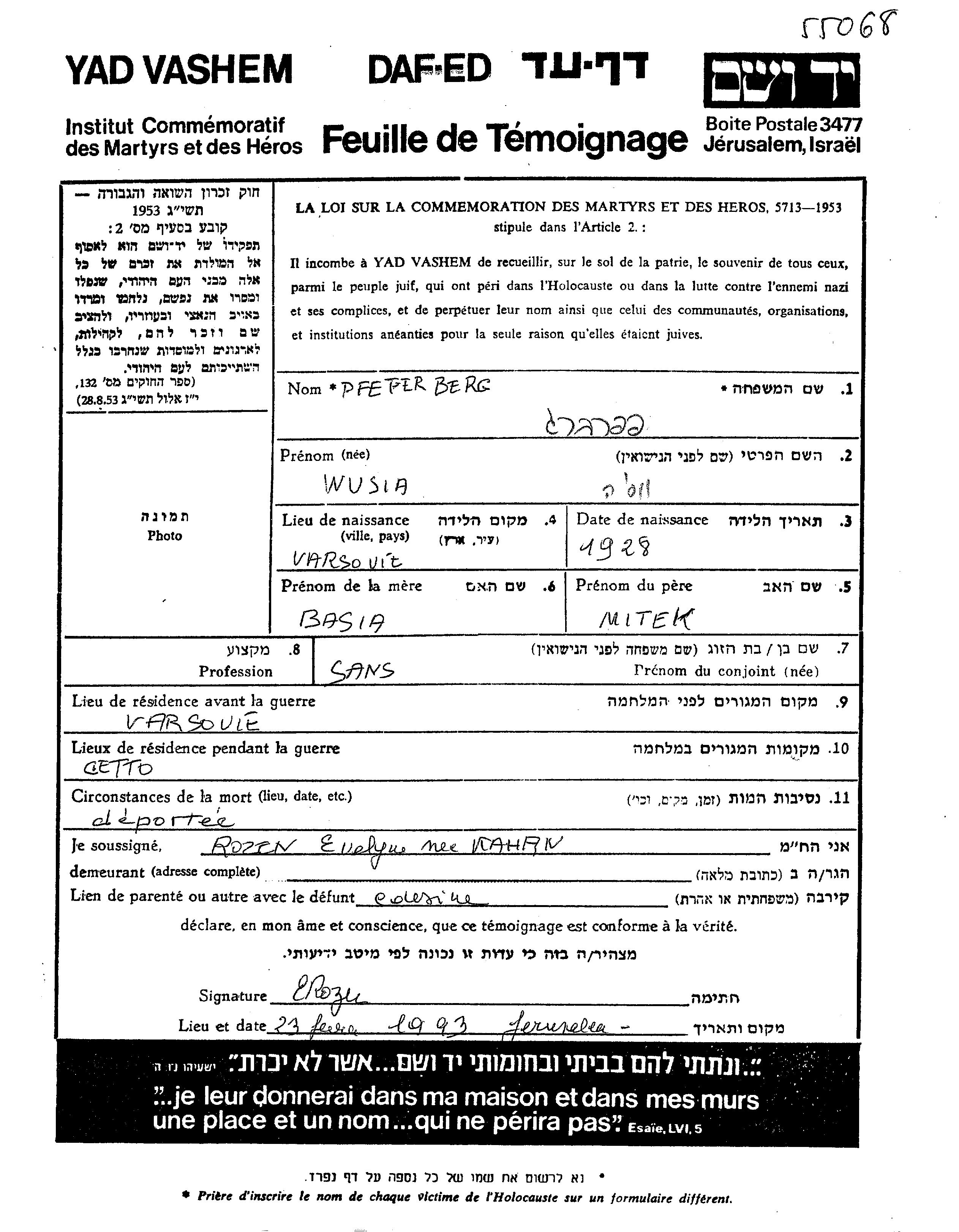 Феферберг Вуся 1928 Варшава, Польша Лист свидетельских показаний