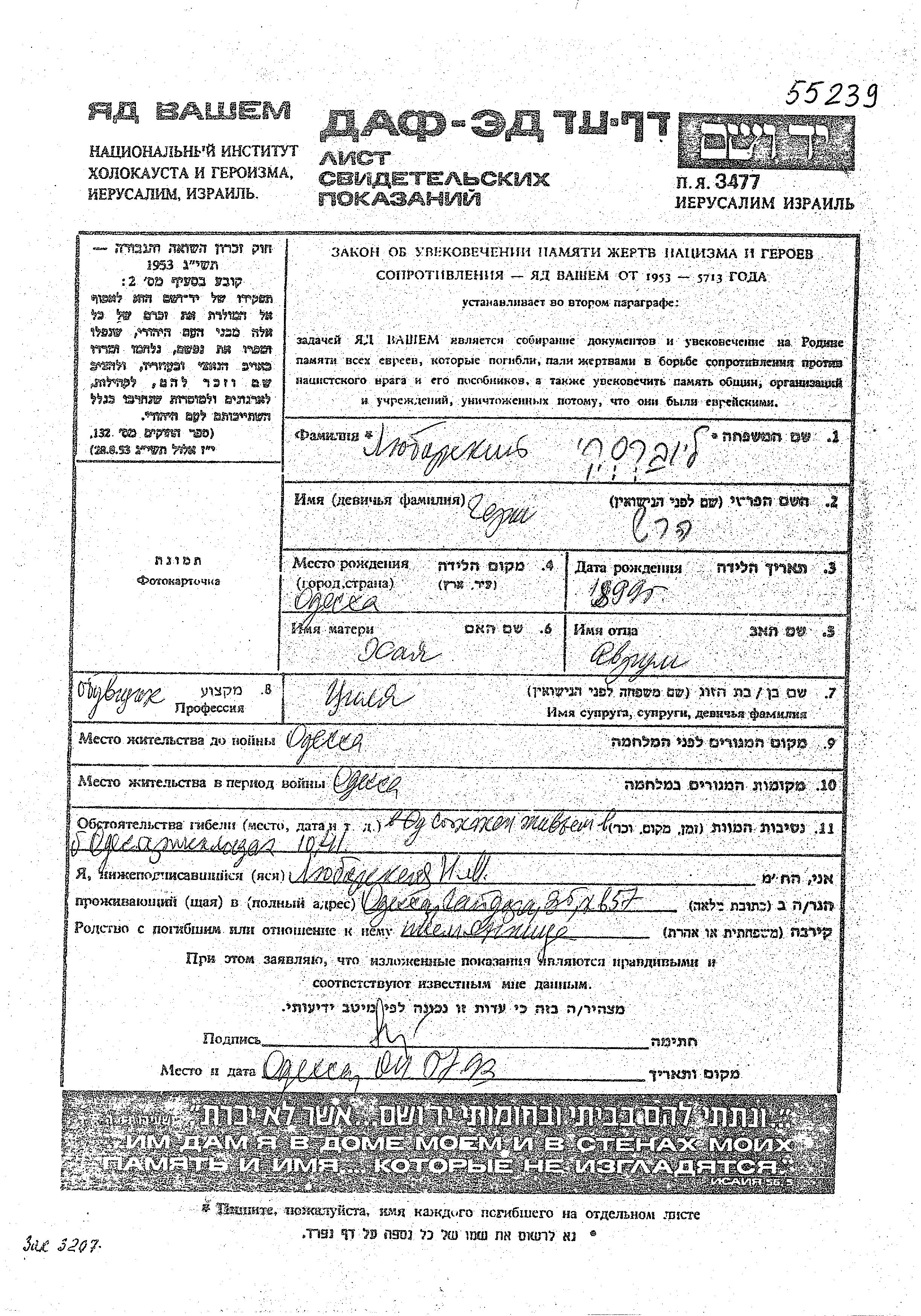 Яд Вашем - Листы свидетельских показаний Мемориального фонда