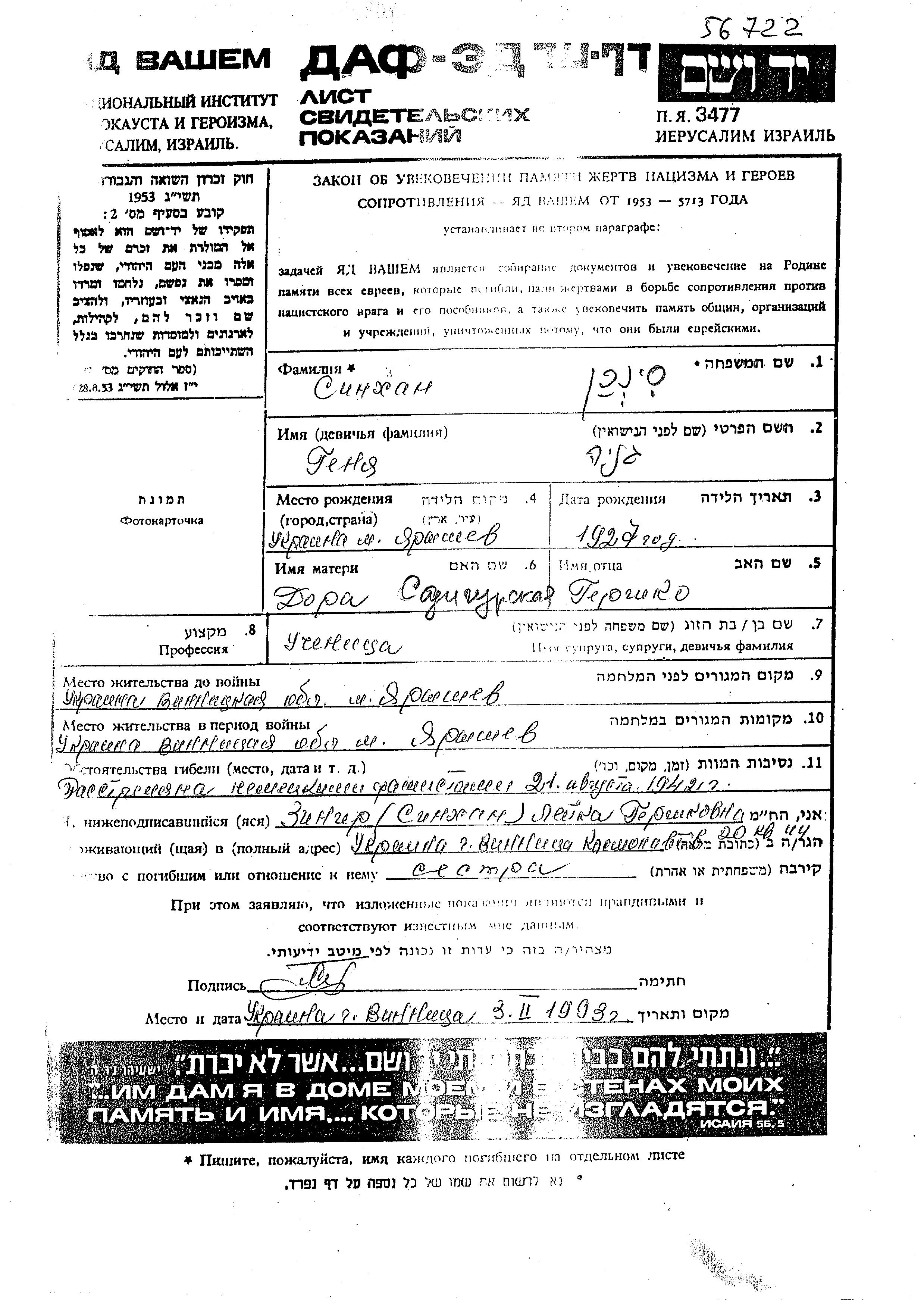 Синхан Геня 1927 Ярышев, Украина (СССР) Лист свидетельских показаний