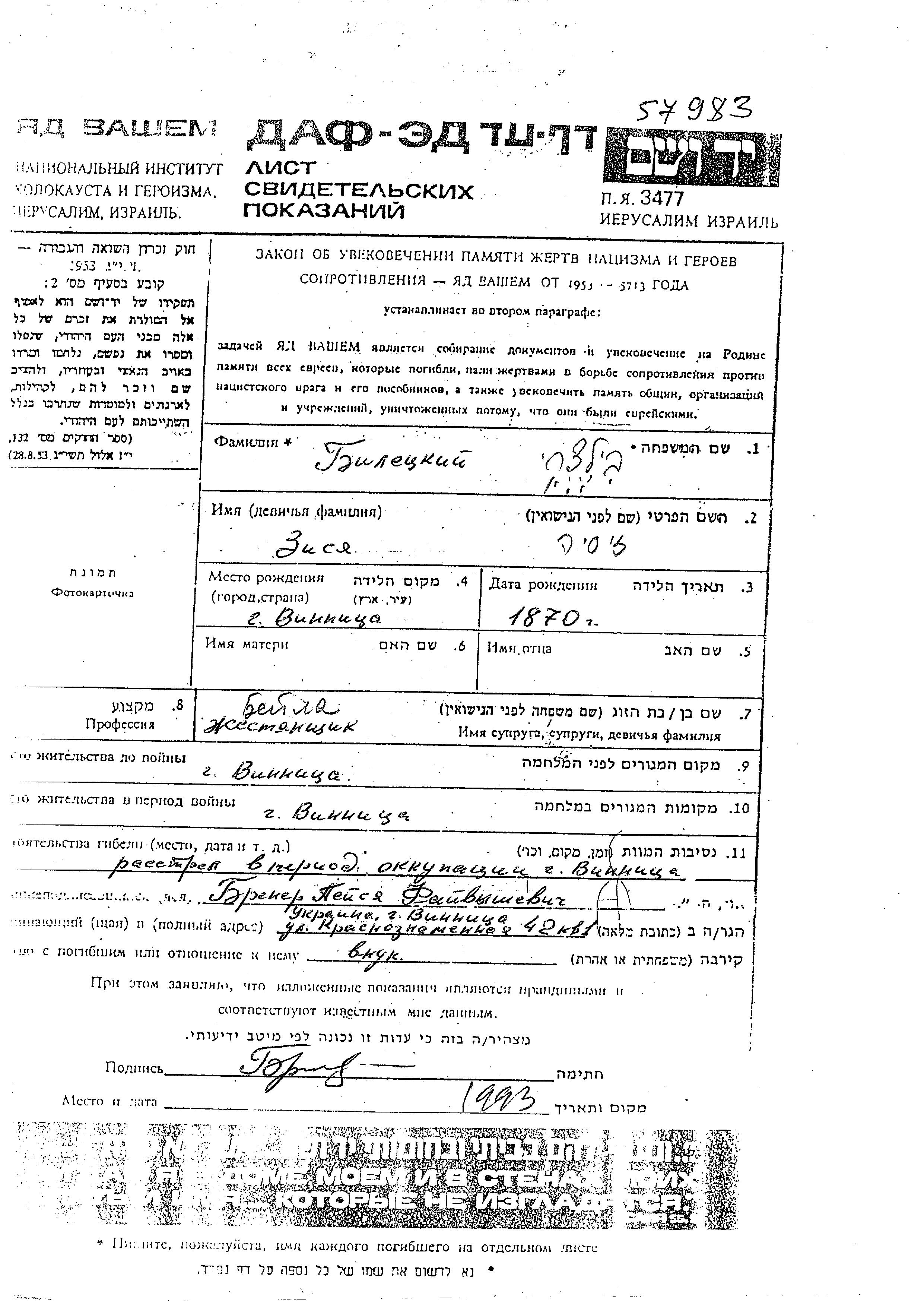 Зися Билецки, место рождения: Винница, Украина (СССР). Жестянщик. Женат / замужем. Место жительства до войны: Винница, Украина (СССР). Место во время войны: Винница, Украина (СССР).