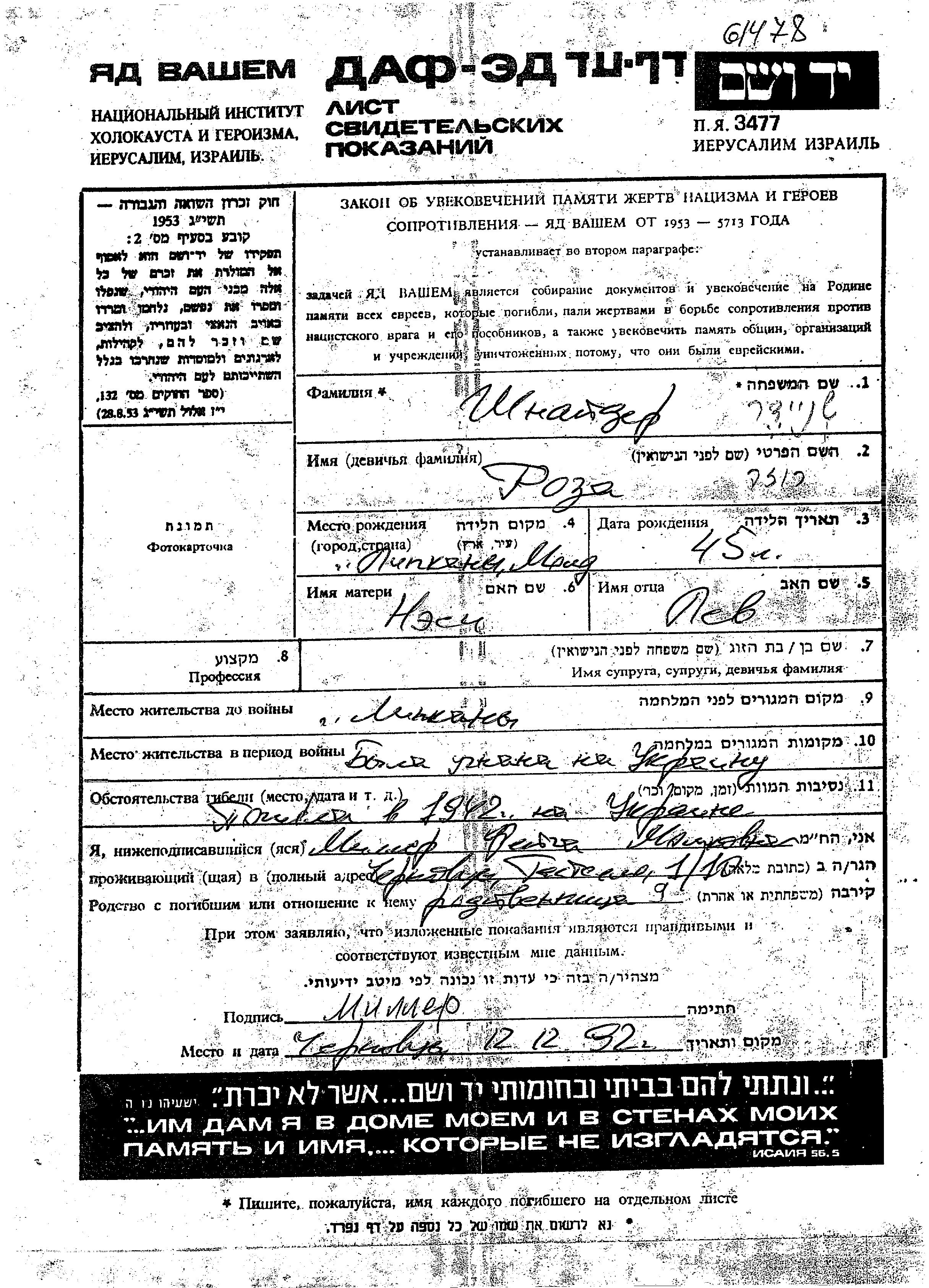 Яд Вашем - Листы свидетельских показаний Мемориального фонда