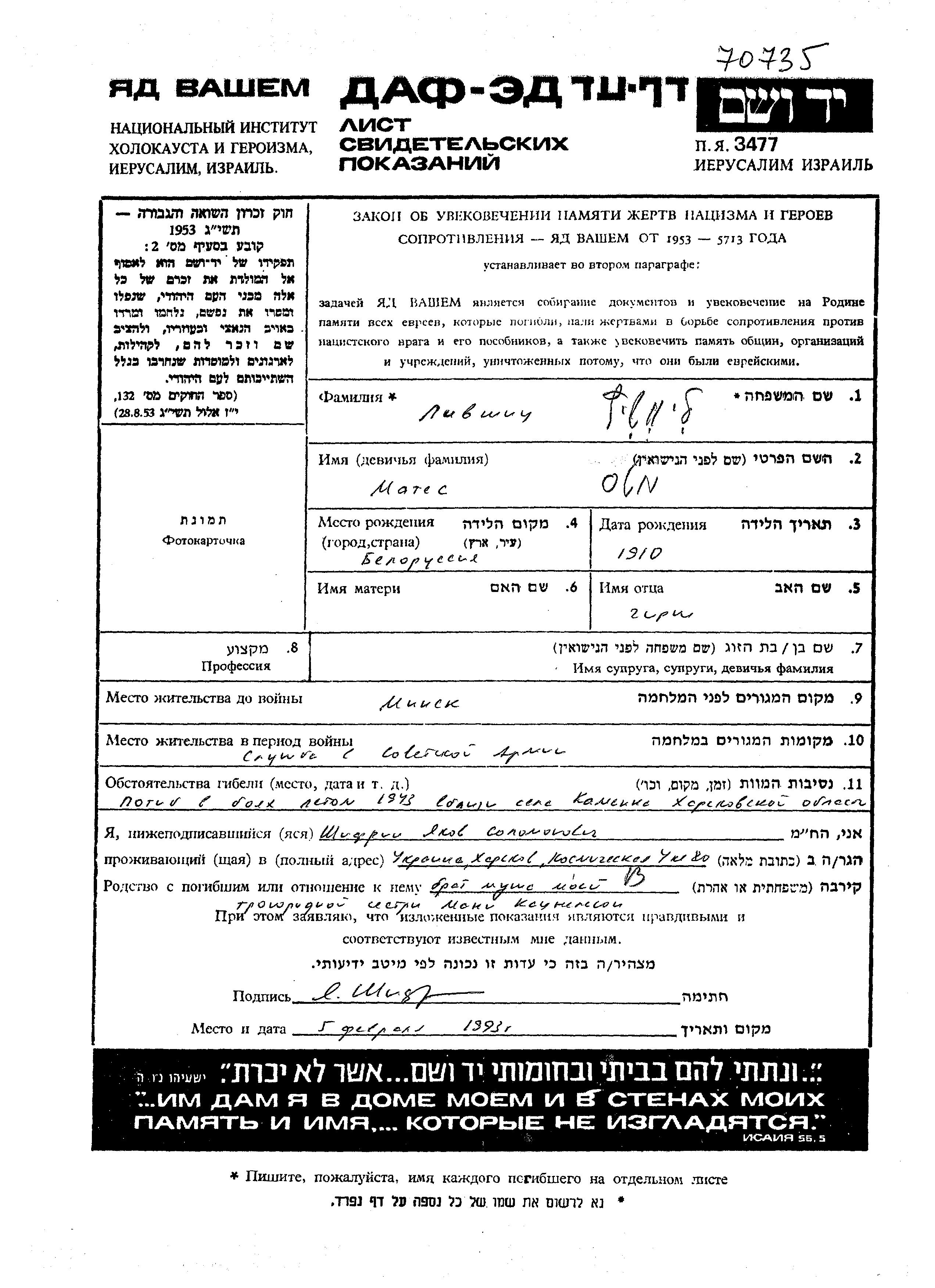 Матес Лившиц, место рождения: Белоруссия (СССР). Отец: Гирш. Место жительства до войны: Минск, Белоруссия (СССР). Место во время войны: Вооруженные силы Советского Союза. Матес погиб на военной службе. место смерти: Харьков, Украина (СССР) в 1943.