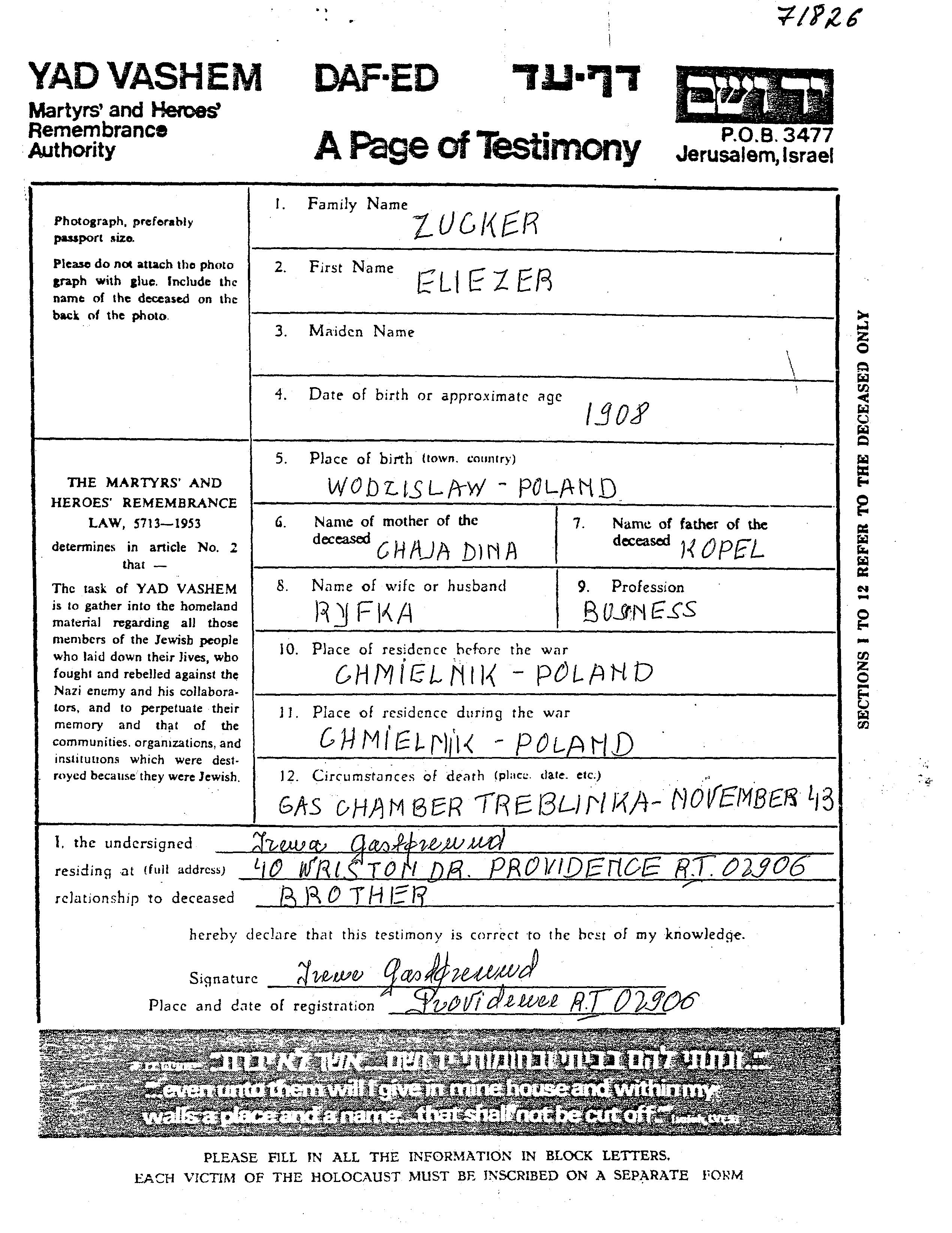 Цукер Элиэзер 1908 Хмельник, Польша Лист свидетельских показаний