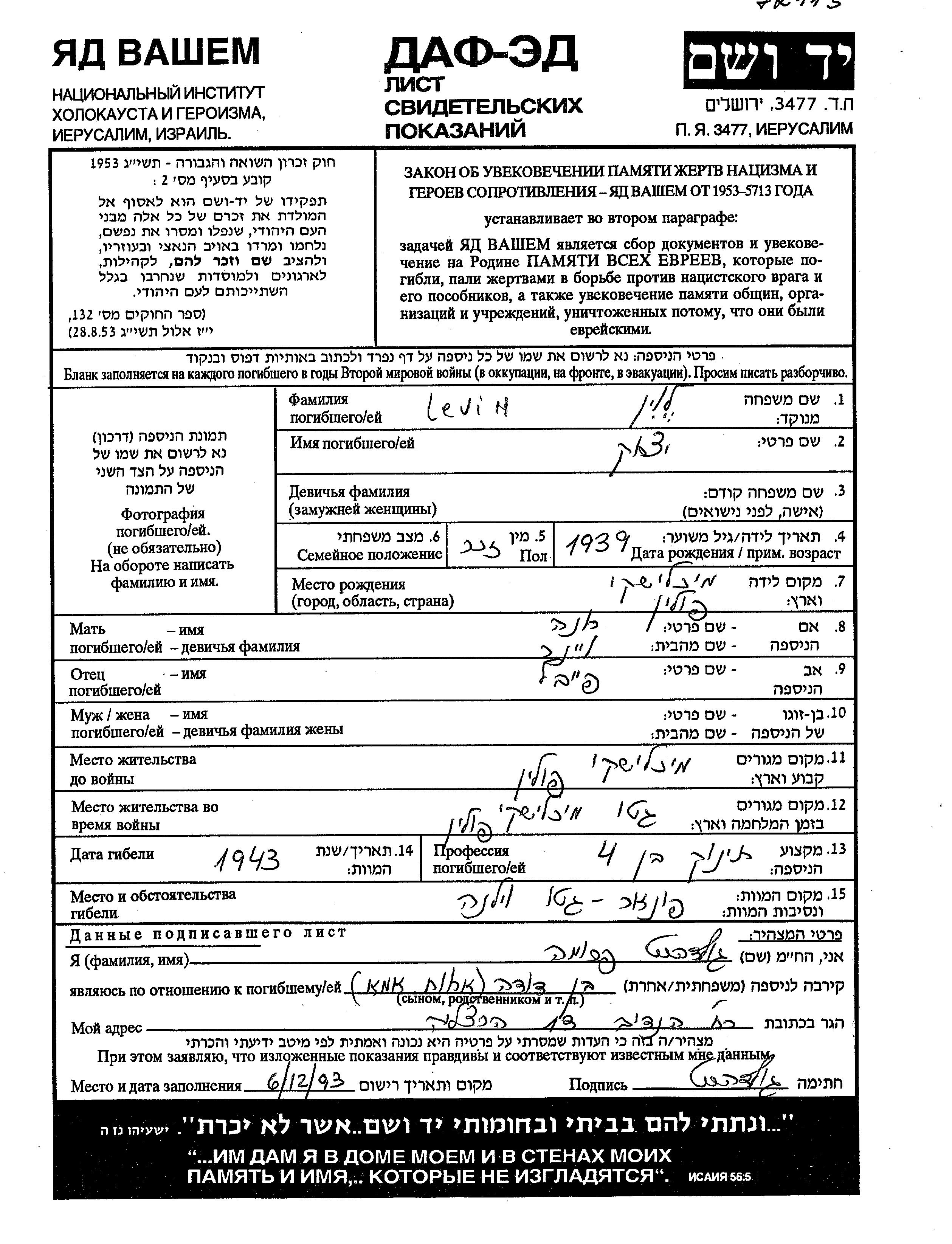 Яд Вашем - Листы свидетельских показаний Мемориального фонда