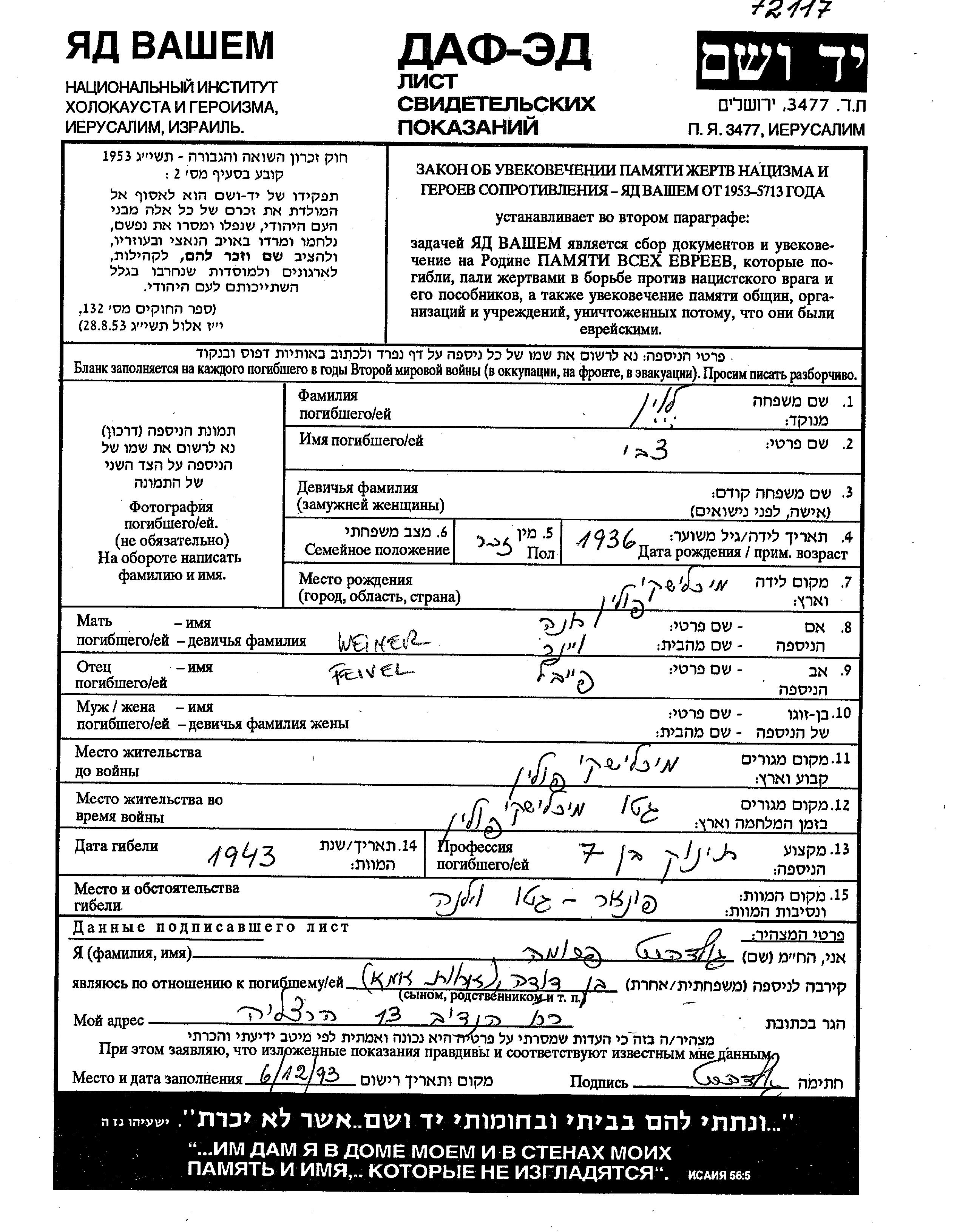 Яд Вашем - Листы свидетельских показаний Мемориального фонда