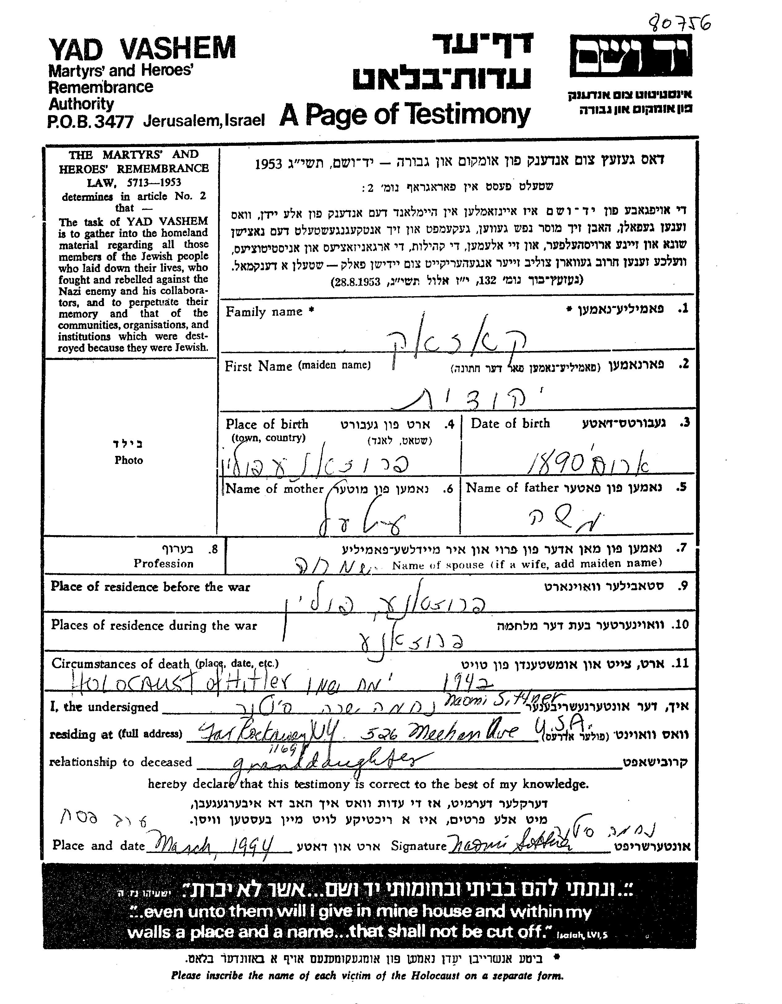 Казак Иегудит 1890 Пружаны, Польша Лист свидетельских показаний