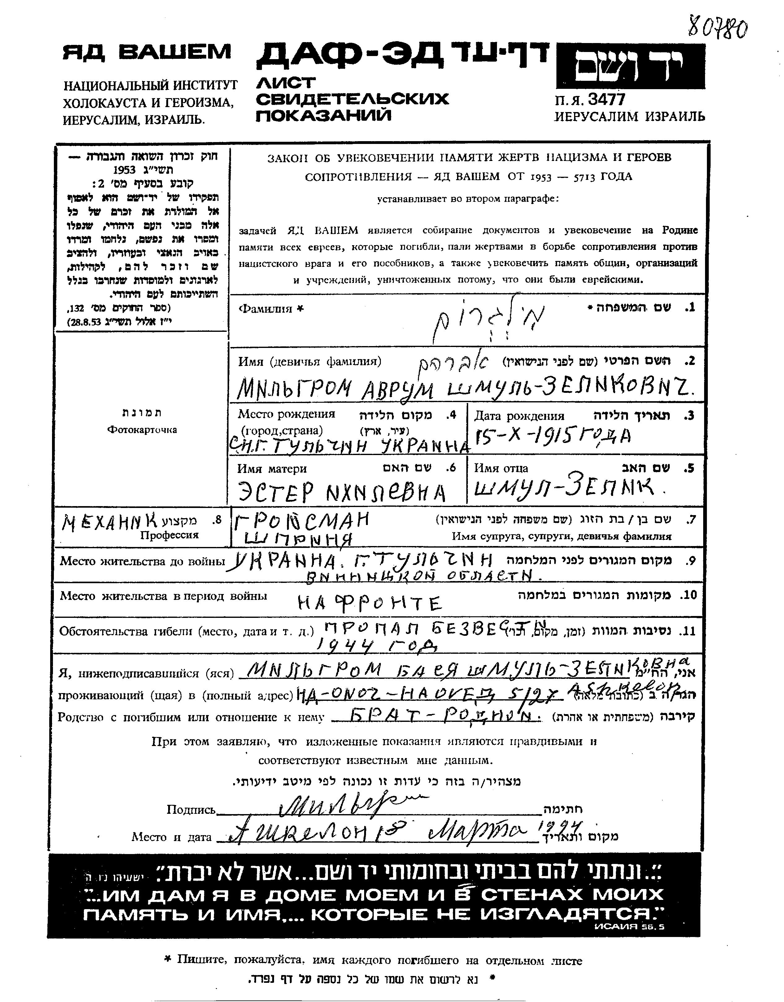 Яд Вашем - Листы свидетельских показаний Мемориального фонда