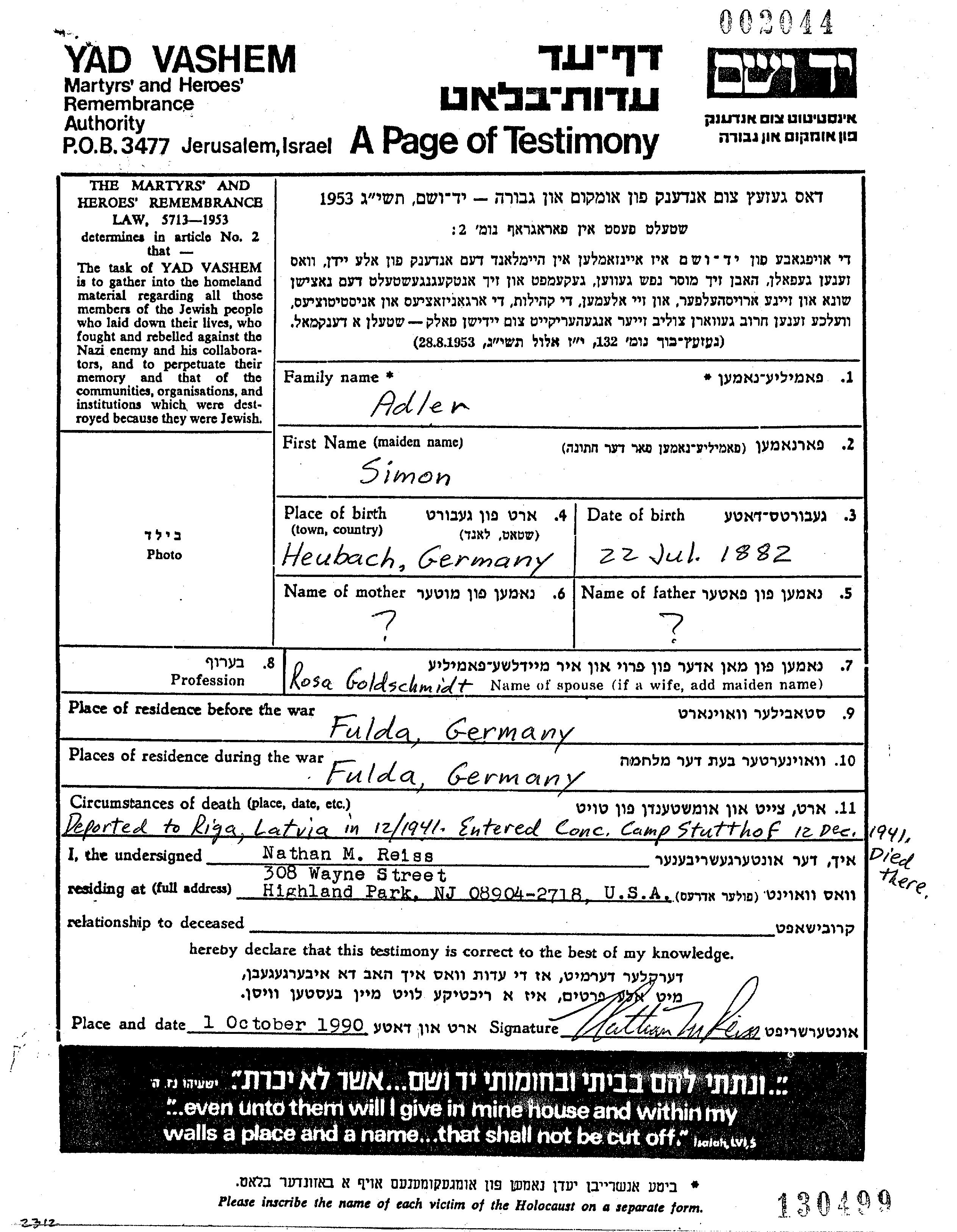 Симон Адлер, место рождения: Хёйбах, Германия. Мясник. Женат / замужем. Место жительства до войны: Фульда, Германия. Место во время войны: Фульда, Германия.