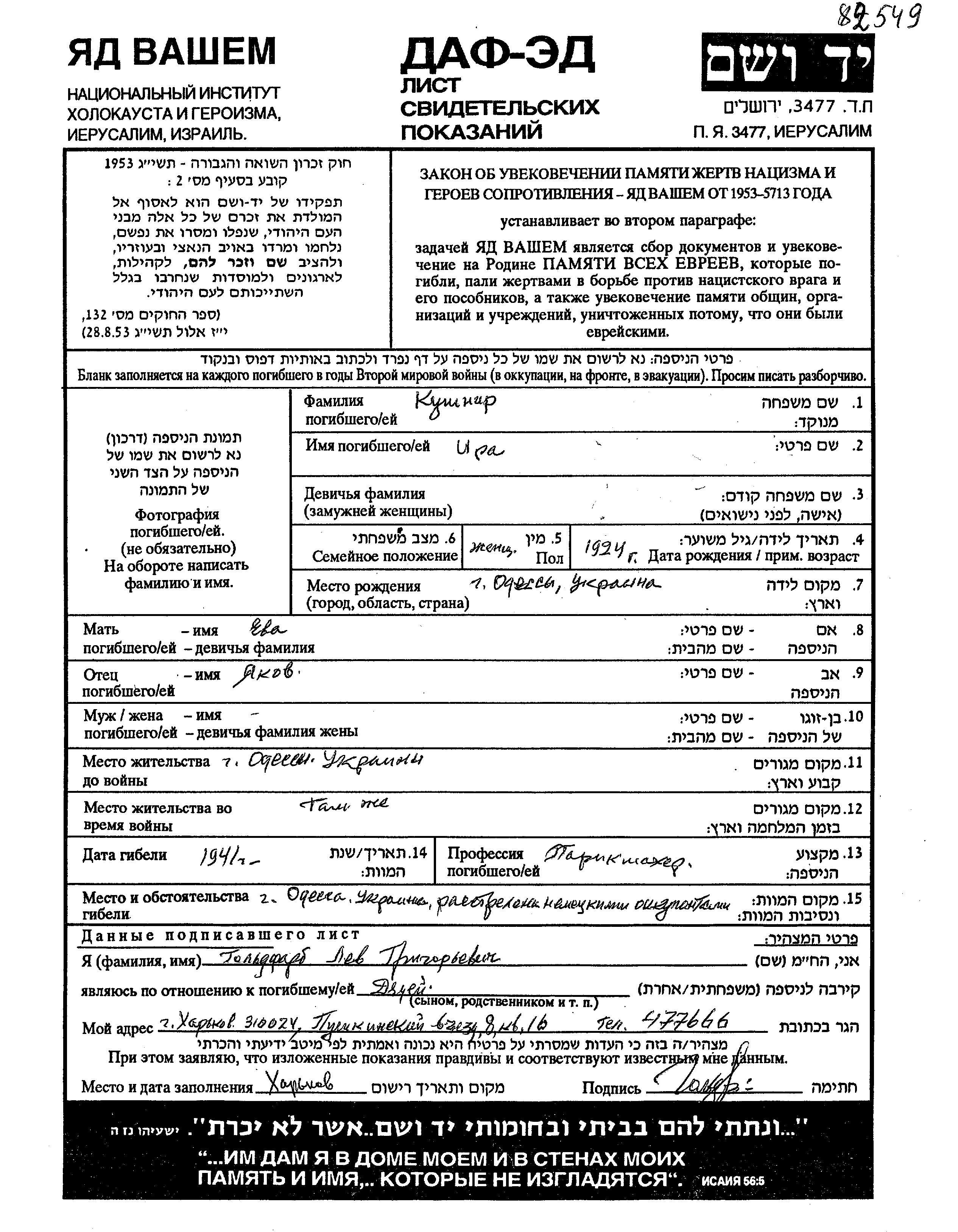 Кушнир Ира Ире 1924 Одесса, Украина (СССР) Лист свидетельских показаний