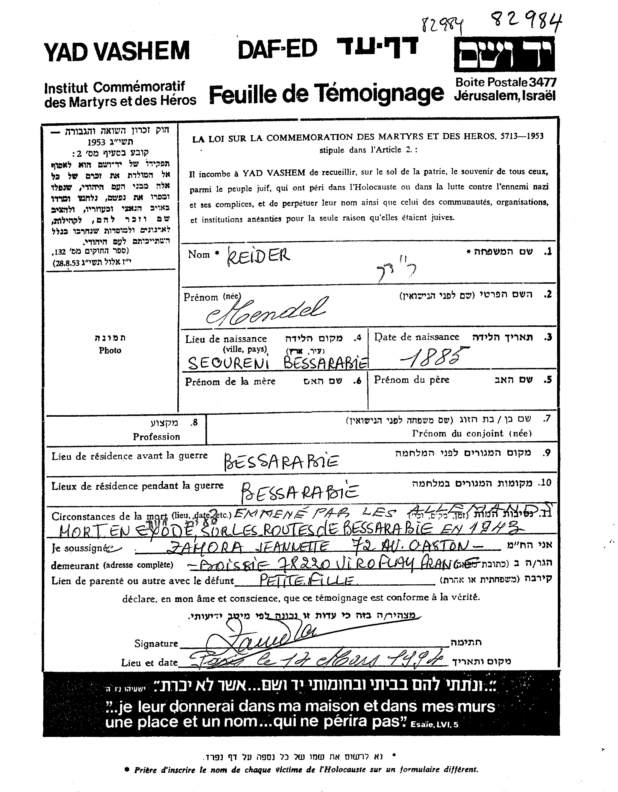 Мендель Рейдер, место рождения: Секуряны, Румыния. Женат / замужем. Место жительства до войны: Бессарабия, Румыния. Место во время войны: Бессарабия, Румыния.