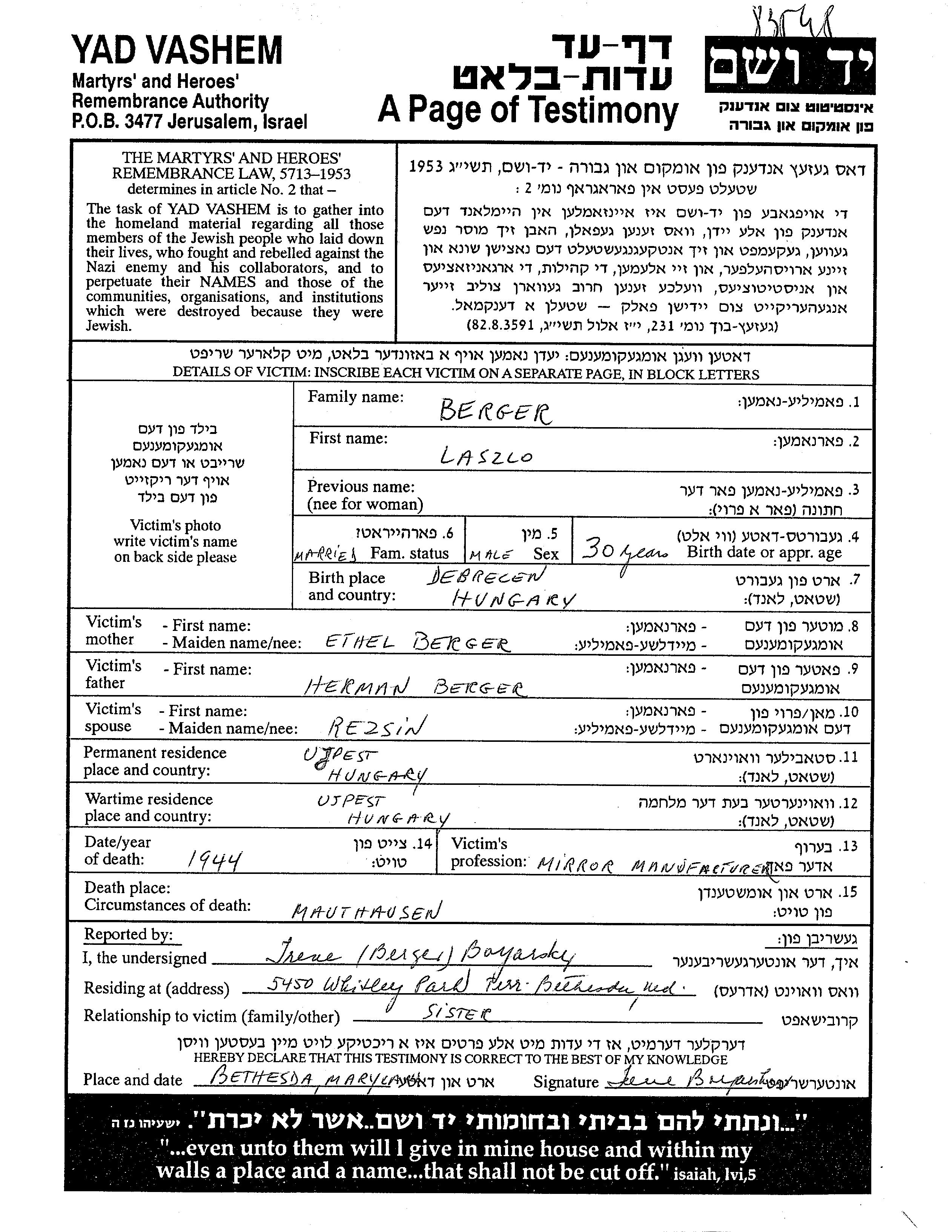 Ласло Бергер, место рождения: Дебрецен, Венгрия. Отец: Херман, mать:Этель. Торговец / торговка. Женат / замужем. Место жительства до войны: Уйпешт, Венгрия. Место во время войны: Уйпешт, Венгрия.