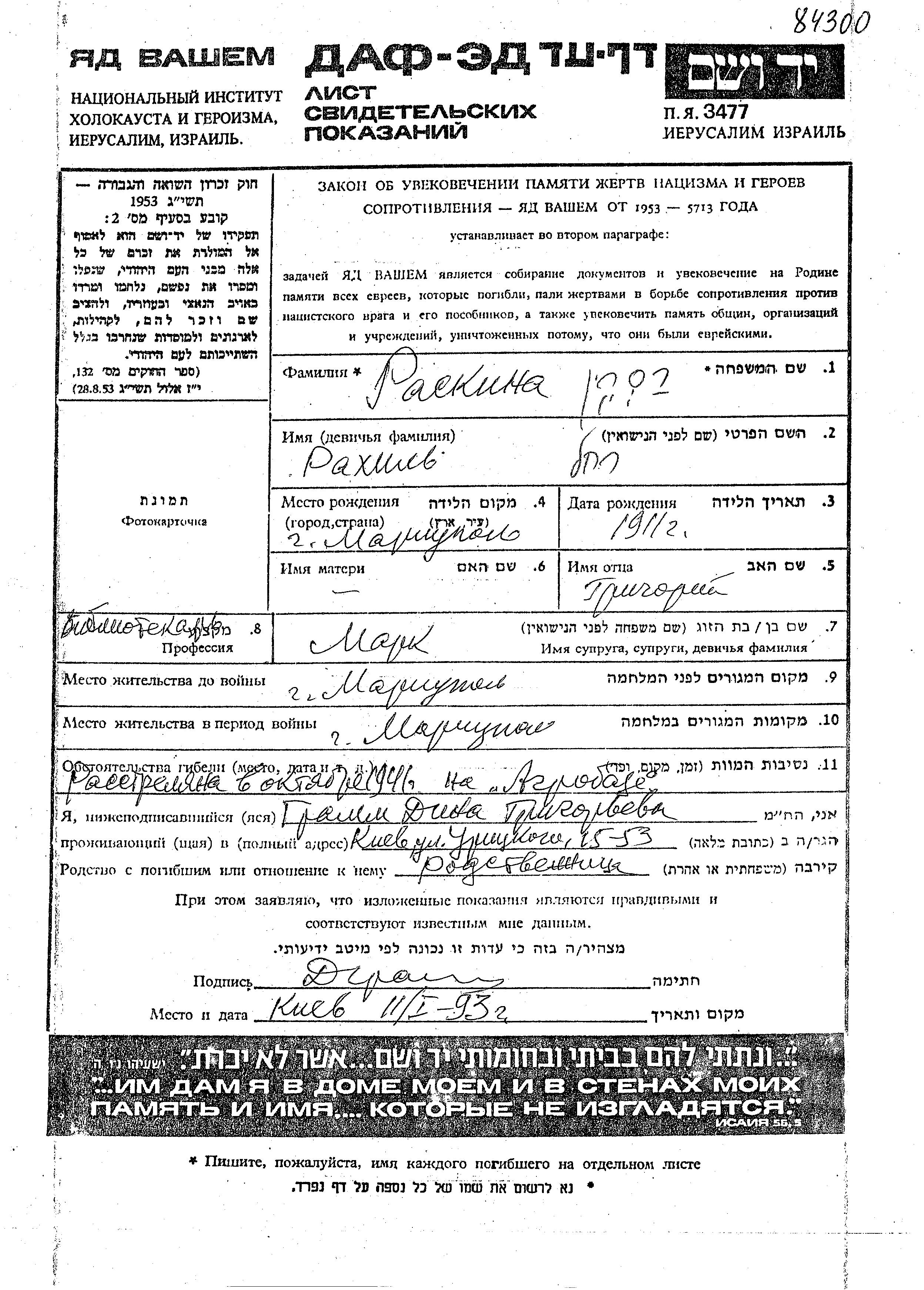 Раскин Рахиль 1911 Мариуполь, Украина (СССР) Лист свидетельских показаний