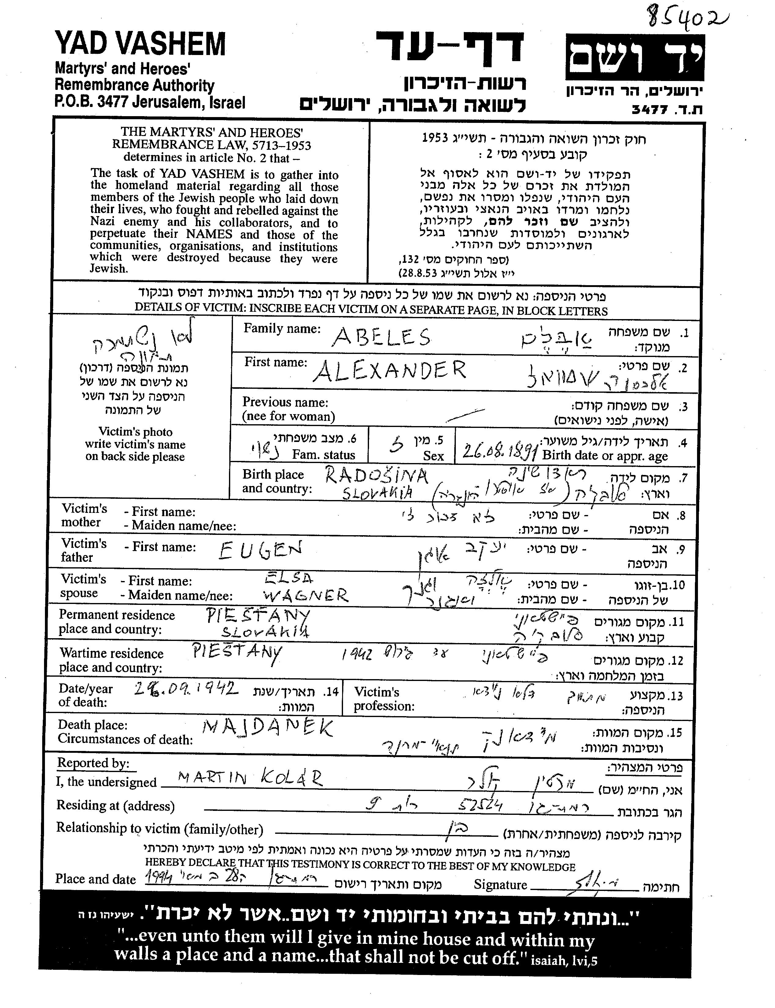 Александер Шмуэль Абелес, место рождения: Радошина, Чехословакия. Отец: Эуген Яков. Маклер. Женат / замужем. Место жительства до войны: Пьештяны, Чехословакия. Место во время войны: Пьештяны, Чехословакия.