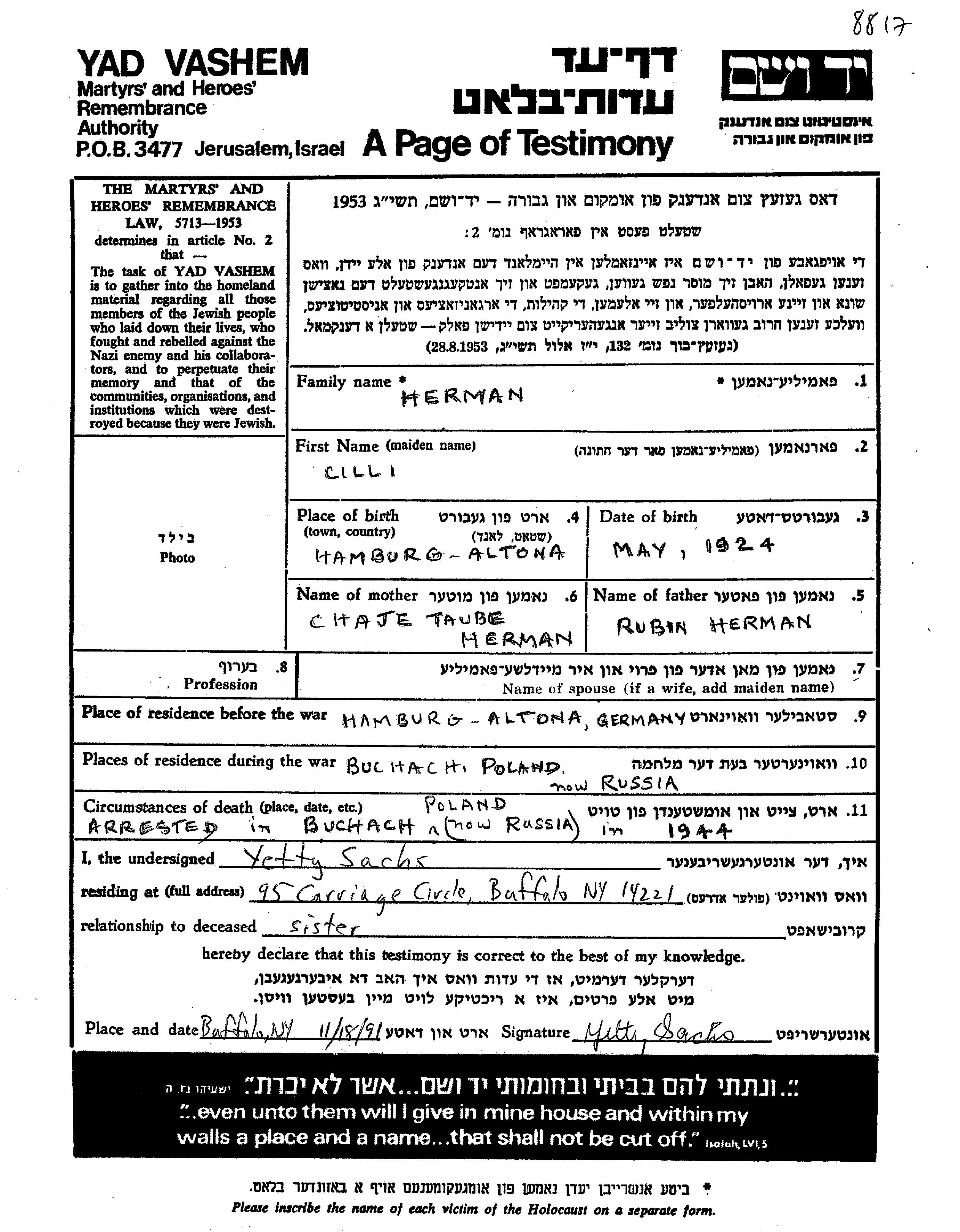 Цилли Херман, место рождения: Альтона, Германия. Отец: Рубин, mать:Хае Тауба, девичья фамилия Хейльман. Место жительства до войны: Альтона, Германия. Место во время войны: Бучач, Польша.